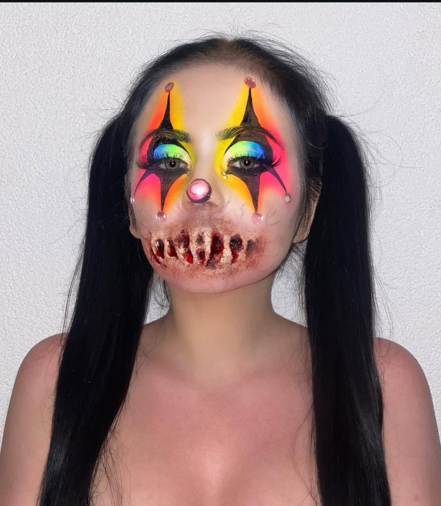 This is the makeup palette of the chaos. Neon rainbows, hard black contrasts, rhinestone brows and oh yes, a nightmare-ish jawline of ripped teeth. It’s creepy, it’s captivating and it is just that type of the clown that no one will ever forget.