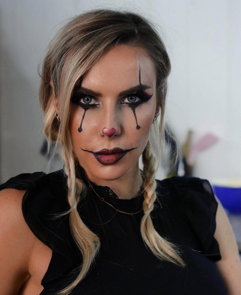 This is what will happen when a collection of highlighters come to life. Electric, brave, and still completely surprising this clown makeup turns a dreamy rainbow into creepy cute manner of deception. The neon gradient combined with stream of black tears gives the impression that Lisa Frank went amok on Halloween.