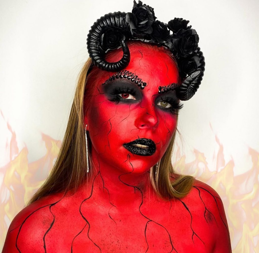 Ideal on medium to dark skin or everyone who is not afraid of a statement color. Apply red body paint glowing with some shimmer and horned crown is not to be missed to create a lot of height. Finish this look of flames with black accessories and bold-statement earrings.
