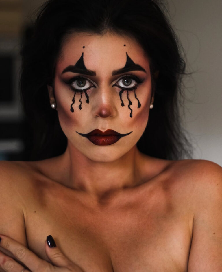 No, This is not your childrens party-clown, this is serious clown seduction. The big arched black eyebrows and tears on the cheeks look very theatrically sad but poetically beautiful. A full ombr e lip and a bold line are making it tragic showgirl at the cabaret, and honestly, I love it.