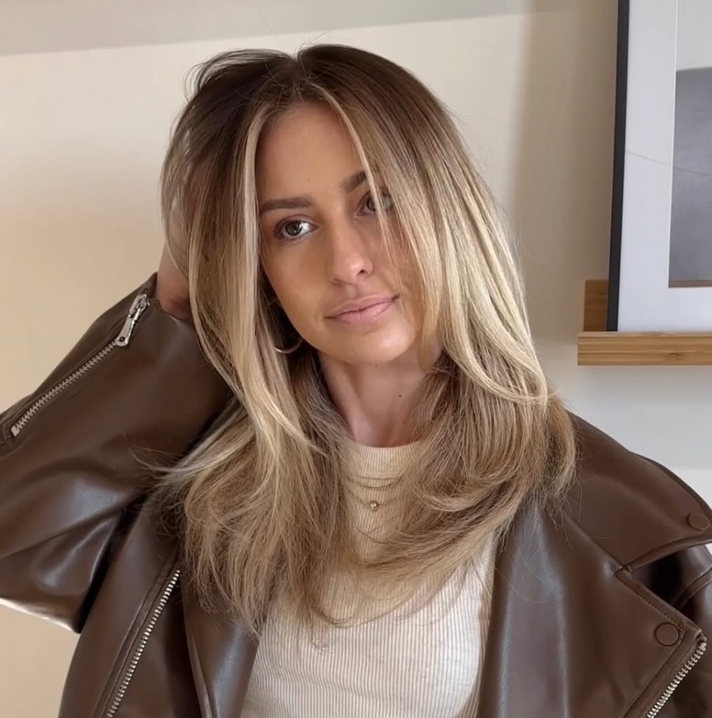 The main characteristic of this beautiful shoulder length haircut is its soft feathered layers that create movement and volume. The pure blended blonde highlights provide an extra dimension so that the hair is flatter and more desirable compared to 50 medium messy layered haircuts. Generous pieces that frame the face help in softening angular features, that is the reason it suits round faces or people, who want a fancy yet easy hairstyle. Wearing a leather jacket together with this style conjures up a smart casual atmosphere—ideal for a cutting-edge woman who is into fashion.