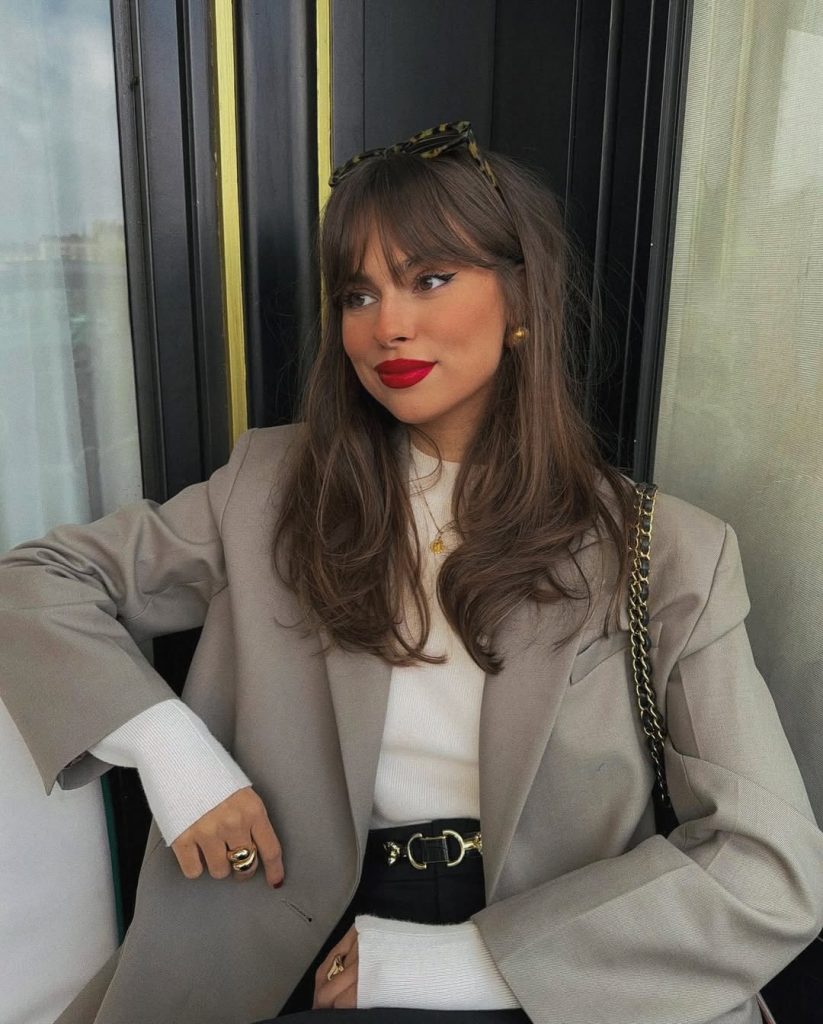 The trendy, multi-layer hairstyle gives off a very cool, chic look with its airy bangs and disheveled waves. The fluffy layers constructing a few visual elements makes it one of the best styles for 50 fine hair because it will give you extra volume without any problem with your face. Just like the entire styling of this outfit, which includes a tailored blazer and eye-catching jewelry, looks inspired by the Parisian style, a combination of vintage elegance and contemporary trends. This hairstyle is perfect for women in their 40s or 50s because it shows how a mid-length haircut can be classic and also trendy at the same time.