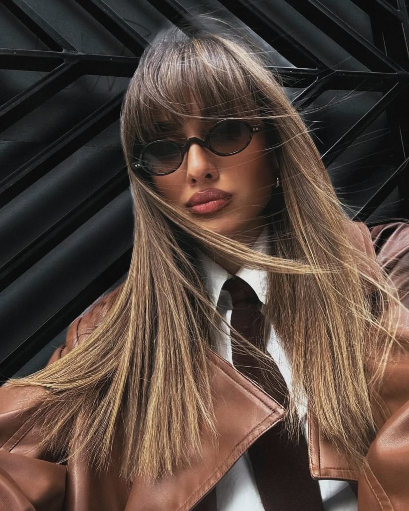 A visually controversial and geometrical medium-length cut full of bangs has its own uniquely compelling power. The straight pieces act as a back of the bob haircut with layers circle face expression effect, thus giving it the double-vision, dynamics, you-visualized-it feeling. The svelte brown color with a hint of neutrality evokes a sense of warmth and richness, which makes it wearable for both 50 gray hair transitions and anyone who is into the modern audacious look. This look is strikingly combined with colorful statement jewels, a leather jacket, and black sunglasses- totally radiating self-assurance and elegance.