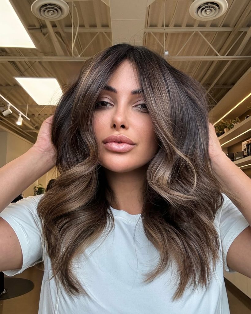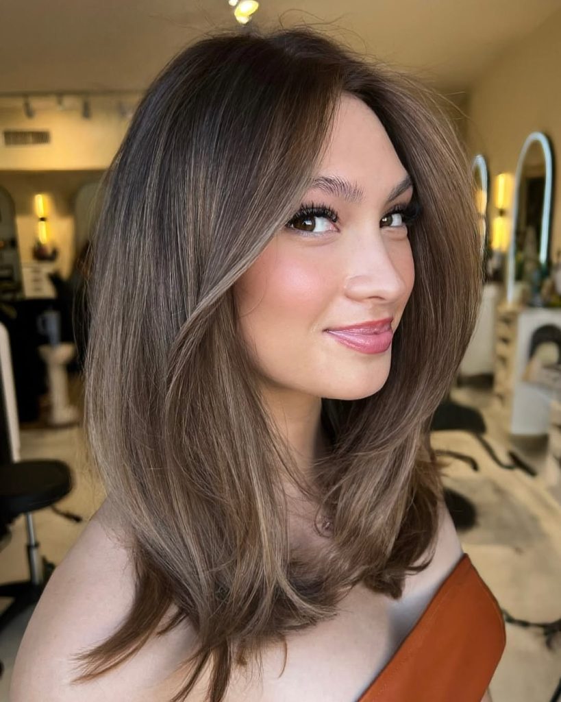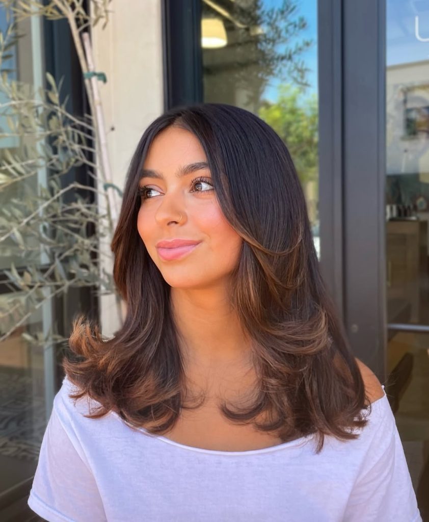 If your choice is the 50 waves that are high-impact styled, this super thick mid-length cut is a winner. The intense dark brown base with a little balayage highlights creates a 3D effect that is perfect for 50 medium-layered hairstyles. Loose waves create dynamics and texture that make this haircut a favorite for women with thick hair or for girls who want a glamorous yet easy-to-style look. The soft front framing layer is the detail that makes this look complete and also it is good for different kinds of face shapes while keeping classic simplicity.