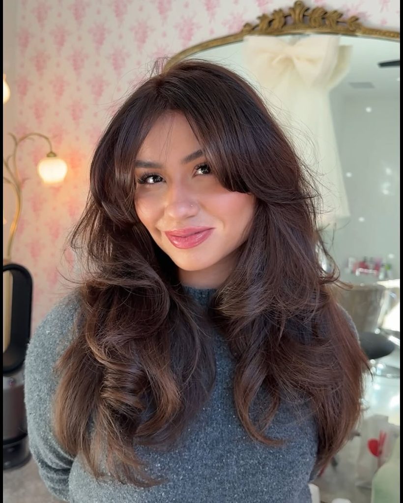 This style is for the girls who are crazy about high-volume fashion, definitely gives a full body and has long layers added. The long bob illusion counteracts the roundness of the face, wqilysbrities mark of playfulness and mysteriousness. The 50 thick hair is even more attractive with the dark brown shade that adds brightness and dimension to it. For women who are in their 50s and want bangs that are both precise and free, it is the most suitable style, which can be worn both for daytime chicness and for evening elegance.