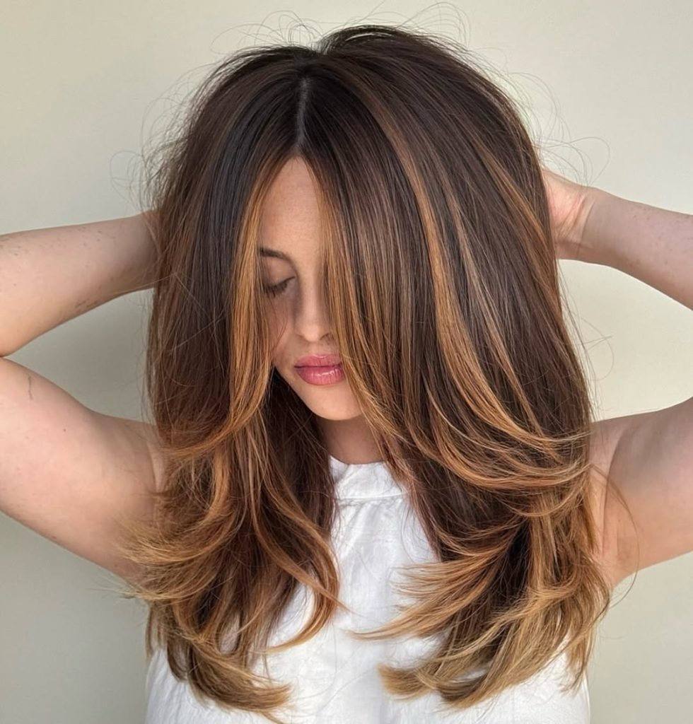 This lively, thick-textured haircut has a classic brown base combined with bright caramel shiny highlights, thereby offering both depth and dimension to the hairstyle. The simplest soft layering and voluminous finish make this style a perfect choice for 50 medium layered hairstyles, thus providing a great balance between fixedness and flow. This design is mostly for the ones who have a lot of hair as it adds body to the hair while somehow keeping it light and airy. The face-framing effect gives a young and attractive look.