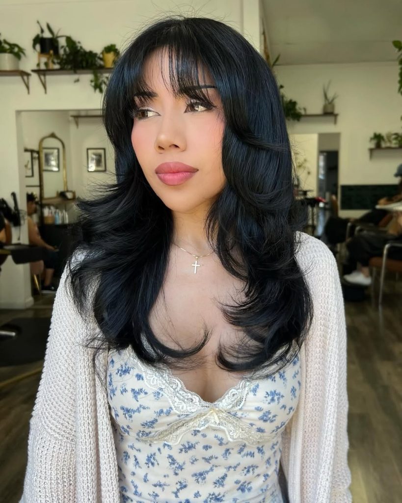 This is an elegant, layered haircut that has curtain bangs and feathered ends, which space out the hair and give it a light, voluminous look. The long layers are perfectly matched with the bangs, and therefore,50 with bangs fans can easily add this soft, romantic style to their collection. Hair density at the top and featherweight ends is how it is stylish and functional simultaneously for wavy and thin hair.