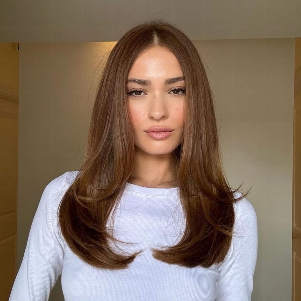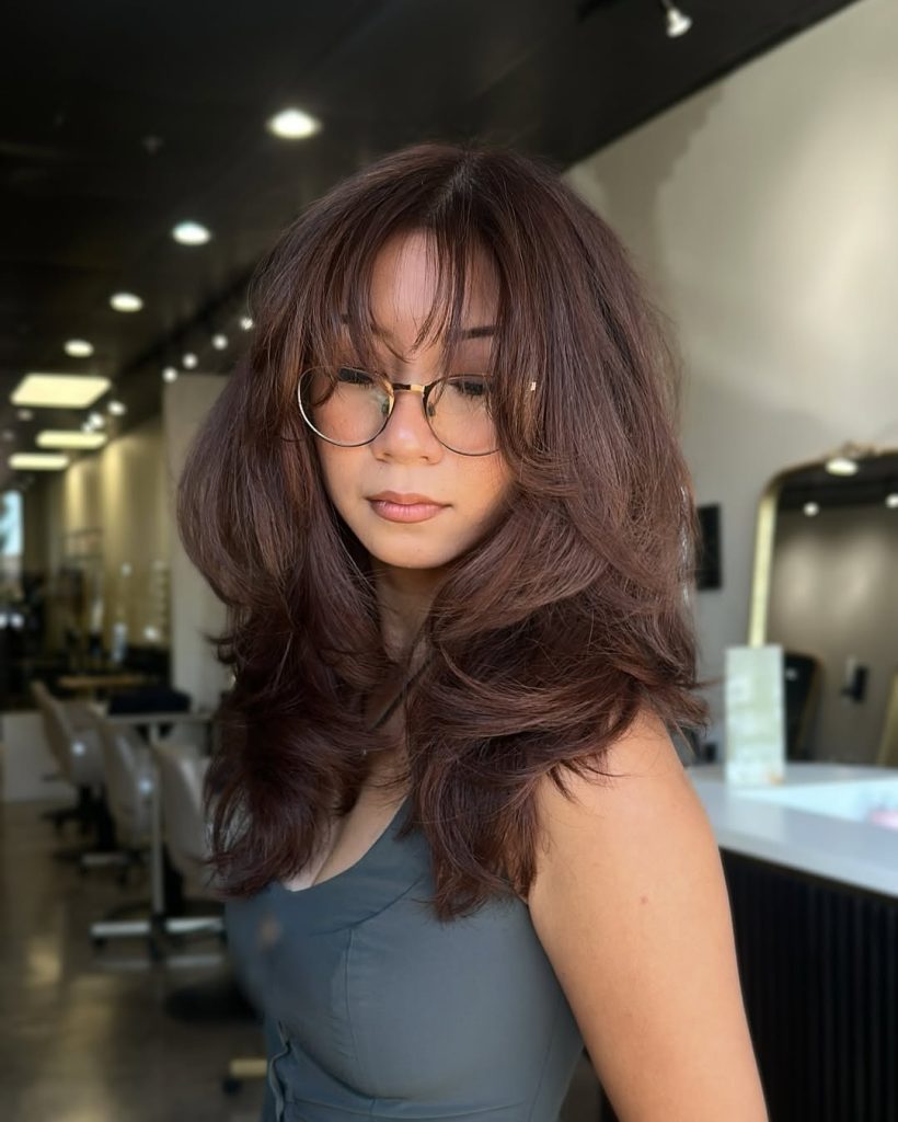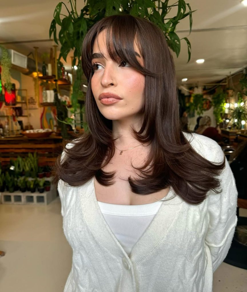 A glossy, smooth finish on a dark chestnut brown color that is used in a layered mid-length hairstyle gives a silky and healthy look to the hair. This cool style that women can choose is suitable for those who prefer a low-maintenance yet still fashionable look.