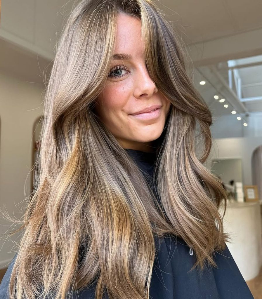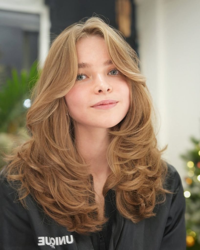 The mid-length soft layers blowout stands for soft, polished layers that create the voluminous effect. This is an example of a layered hairstyle that you can get for 50 medium layered hairstyles, where the long layers framing your face perfectly are the best. The warm and bright touch that the creamy blonde tones are giving to the hairstyle makes it look ageless, and classy. This look is incredibly girly and can be worn informally and formally at the same time, with an off-the-shoulder sweater.