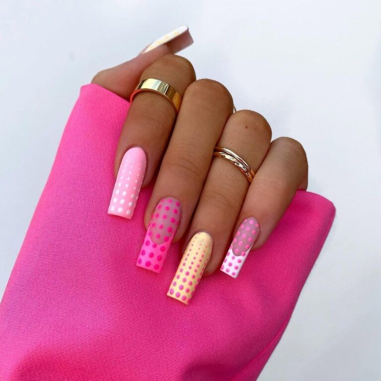 These elongated nails, which are colorful and cheerful, are dipped in a dotted gradient of hot pink, bubblegum, and pastel yellow. One lollipop each finger presents a different pattern and base, and thus the entire set is perceived as custom-made and unique. It’s the summer candy store, and the energy is as sweet as the sweetness equivalent of this manicure. Absolutely a bright alternative for emotional and fresh souls that enjoy the juicy side of the year 2025.