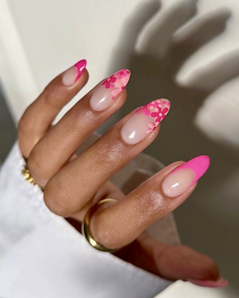 Hot pink is the summer color, and this stiletto-shaped manicure proves it with the addition of floral accents that are virtually. Background shades of bright pink neon elements of half-framed flowers upside down on a translucent nude base is so greatly odd this and that sharp contrast. The very combination of the two provides this effectiveness in the shape of both: being relaxed and chic. As the addition to the gold jewelry or white linen outfit, this look goes along with a distinctive middle style. It never appears to be smaller. A fine selection for the summer season to go out to the refined motel at night or to show out in the city on the beaches of the statement moment.