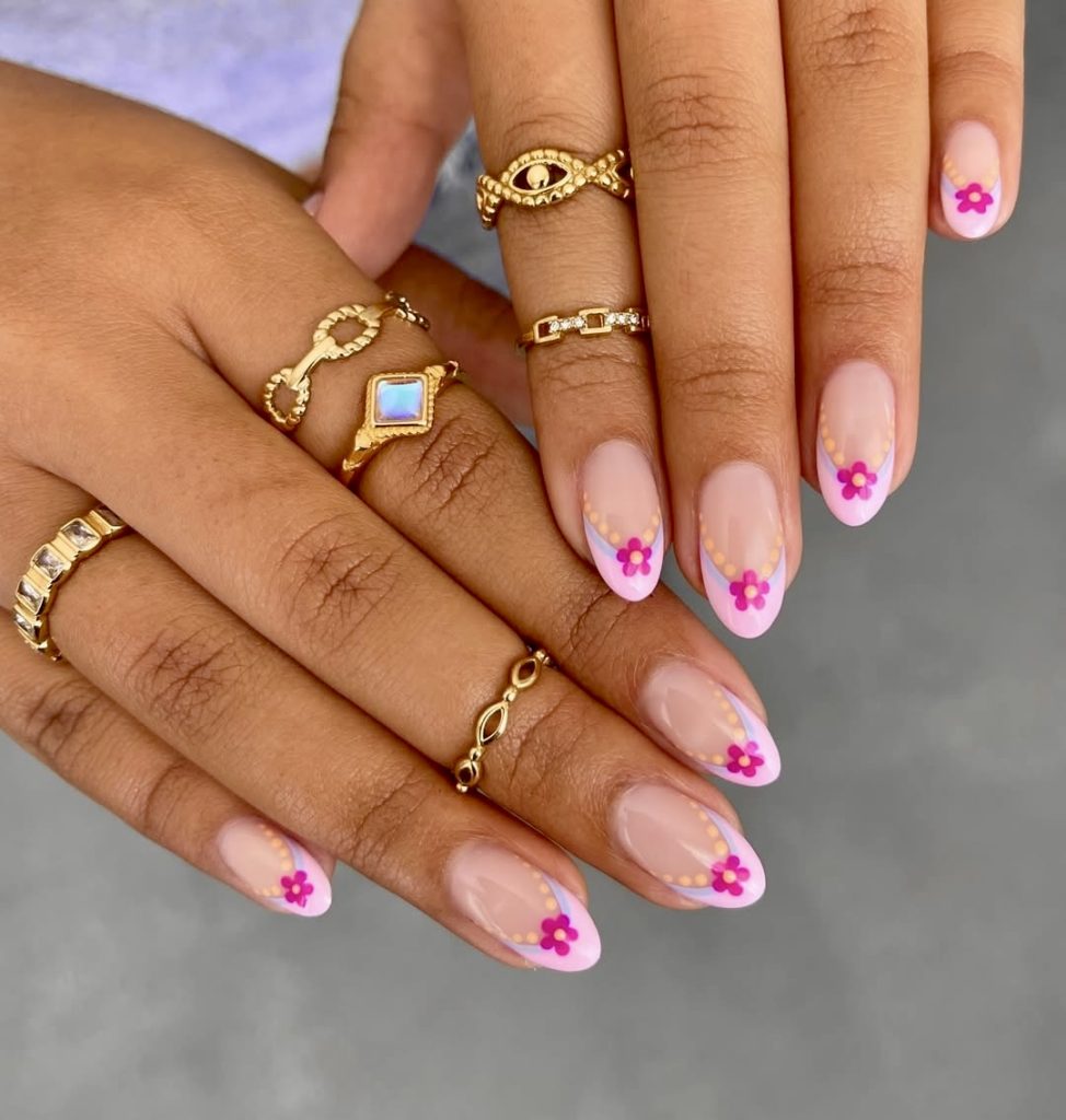 The French almond shape is affirmatively used in the reinterpretation of this manicure aimed at showcasing a perfect combination of nature and tiny flower accents in mild lavender and pink. The simply but artistically designed arc of the tips legs the framing effect with the eye being drawn to it, in similar fashion, they employ the beaded effect with small yellow dots that appear to be jewelry embellishment for the final result. The overall view is that this style is very straightforward and stylish, so it would be a great choice for minimalists who wish to include in their wardrobe a little bit of summer. It is a simple yet classic style that is totally wearable.
