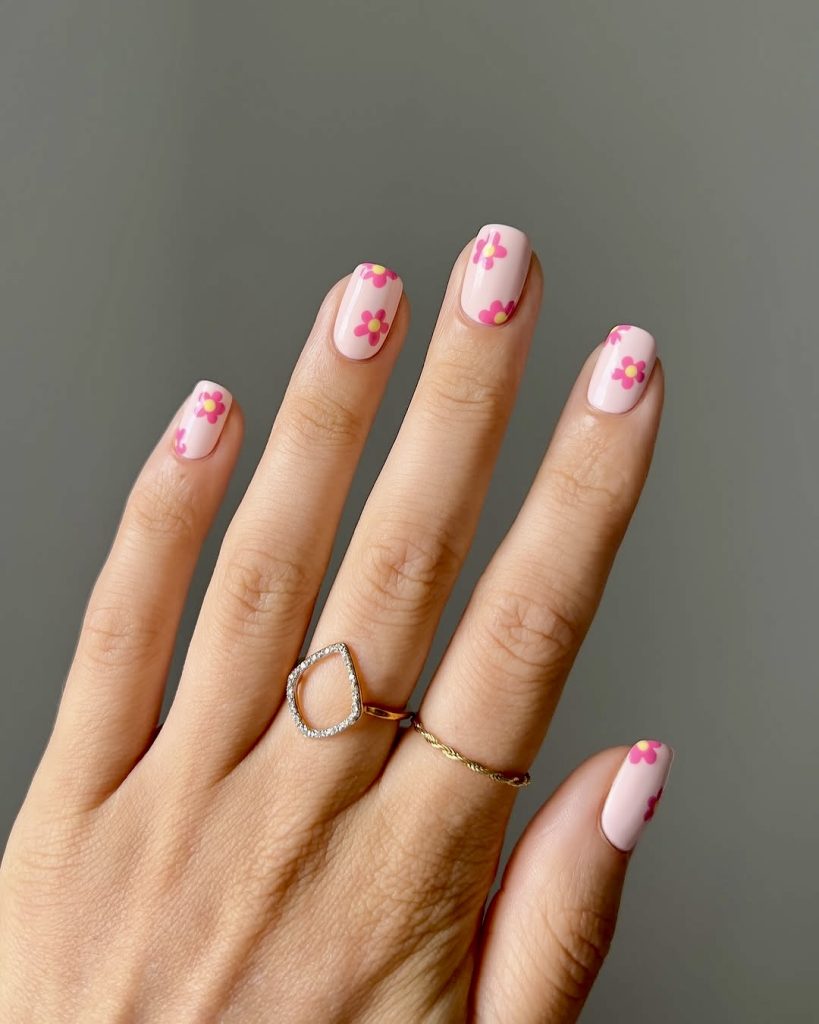 Without any conflicts and with the utmost simplicity, this short square nail polish shows that in some cases, less definitely means more. A neutral base is embellished with tiny pink flowers together with minute yellow dots that blossom over it. This is the most wonderful, soft, and fun yet refined polished look. It is ideal for people who are into the natural, low-maintenance style yet still want a bright detail for summer. This creativity is like enjoying iced coffee and possessing fresh flowers in your windowsill, which are the purest forms of enjoyable feelings in 2025.