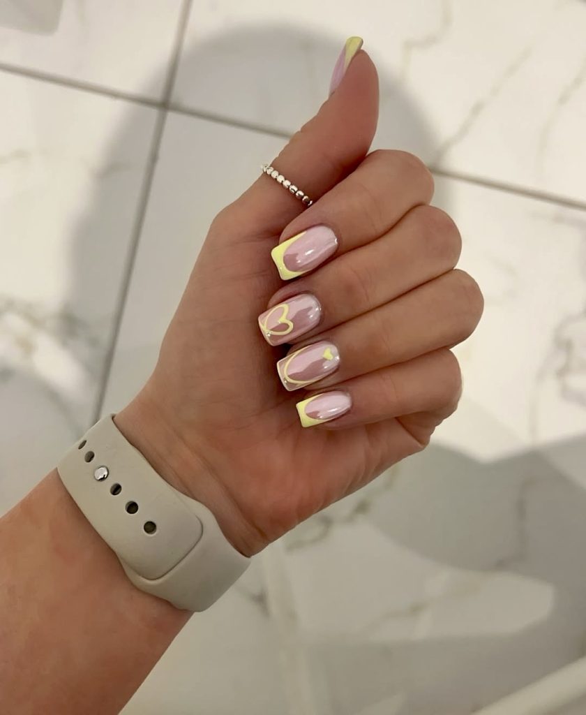 This is a beautiful interpretation of the classic French design for summer fanatics—showing off spectacular gloss pink nails with a sweet yellow edge. The feature of this ensemble is the lovely accents: minimalistic hearts and clean soft curves, perfect for those who want to look a bit romantic and retro. These short and uncomplicated nails can only be used for selfies at the golden hour or for picnic dates at the park. They are fresh, and feminine, and have a timeless wearability that is only long enough to hint at color without overwhelming your look.