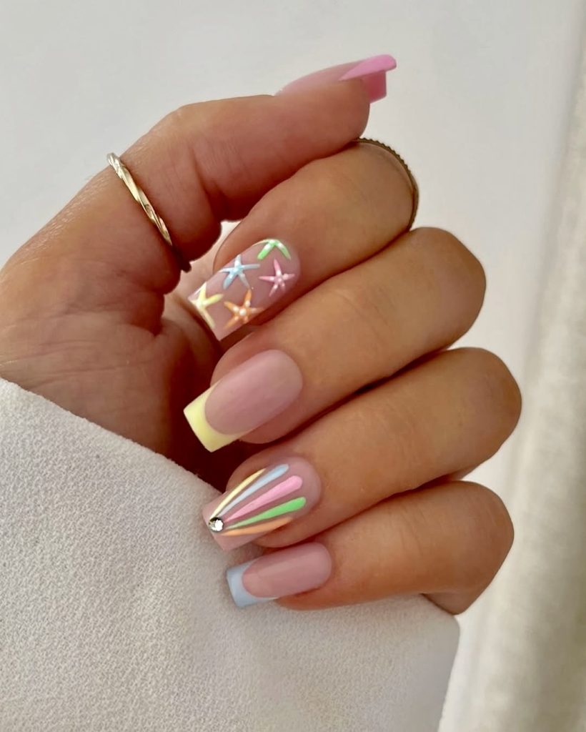 This square nail doodle will be the confetti if summer is a party. With matte nude bases, each nail becomes a canvas for pastel rainbow details-from holographic starbursts to striped rays ending in a rhinestone accent. The color-tipped edges in orange, pink, blue, and soft turquoise not only show an unusual design but also the latest trend for 2025. It’s the type of manicure that makes every outfit feel a little more exciting.
