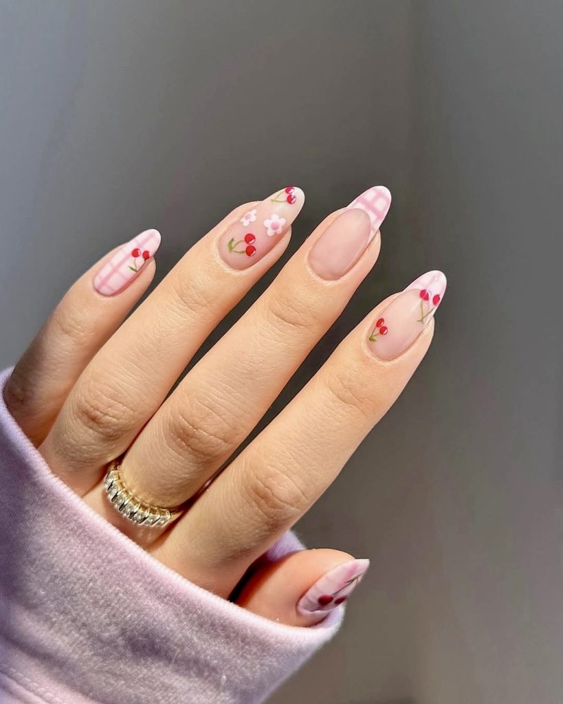 This lively short almond arrangement reflects a tiny piece of American culture with its red cherry patterns, floral embellishments, and pink gingham plaid. It’s a sweet tribute to classic summer fun, mainly because it is neutral with bare nails as well as a couple of solid soft pinks. Consider the scenario of walking into roadside diners, wearing vintage dresses, and putting on that ideal cherry lip gloss. If you want a straightforward way to embrace the nostalgia of 2025, then this design is as sweet as pie and hence equally satisfying.
