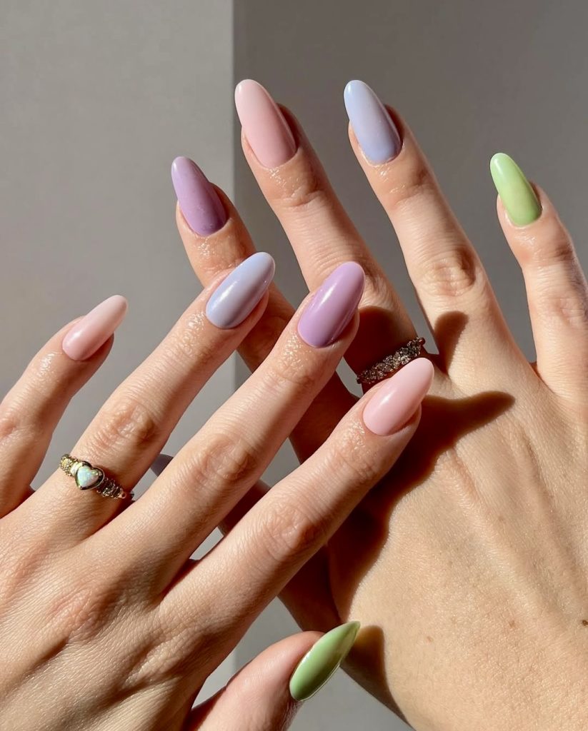 This almond-shaped pastel manicure is the icon of the classic and impressive elegance that is always in style. With its 5 soft colors-mauve, lilac, soft blue, blush, and sage green-it is an absolutely dreamy color-blocking design for 2025. The glossy finish is just the right touch of shine to elevate the look while it is still remain natural and chic. Ideal for days you want to dress your nails in the mood of feelings without compromising polish or character.