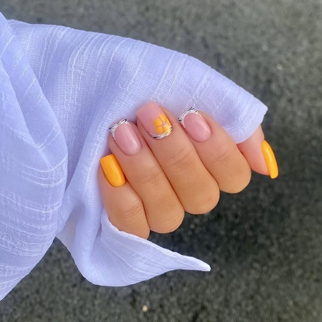 Summertime is indeed easily characterized by a mix of colors, and so is this short design, which is playful art and saturated orange tones that you can see at once. With a pineapple detail, coffin shapes, and zebra-patterned French tip accents, this design is a simple statement yet one that remains very breezy and cheerful. This nail art is really a statement that just feels light and sunny even if you are going for swimming pool parties or just looking for something impressive, it totally gives off the vibe of tropical fruits, and it is a perfect match for a volumetric look during the holidays.