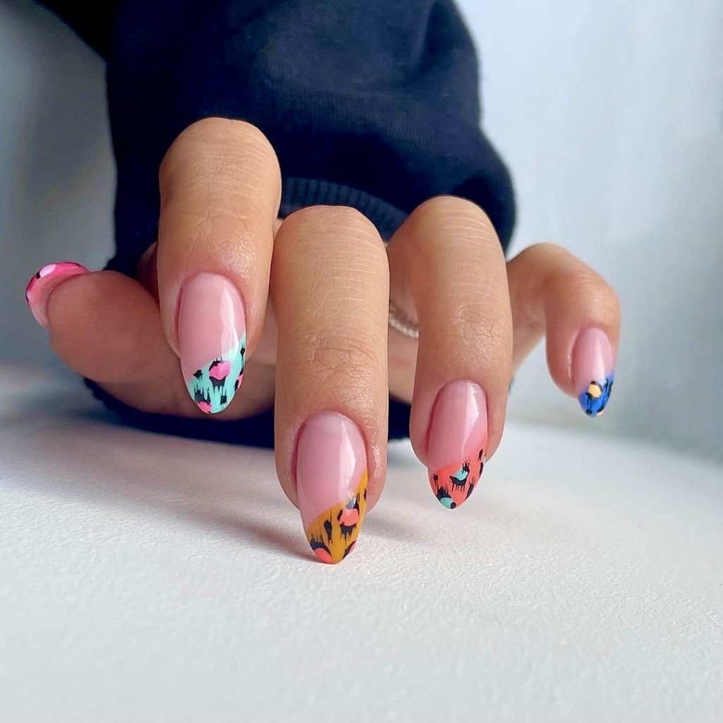 A very interesting accommodation to the cement French tip style and these almond nails. Instead of white, the colors embedded are the tribal-jungle color. With the likes of bright pink, mustard, teal, and cobalt, it really seems that every tip is a vacation-ready brushstroke of creative genius. The abstract patterning that fits well with those who are into outdoor adventurer’s style and also looks awesome by wearing it with even the most basic clothes. You can have the whole summer festival vibe with just a few changes in the way you dress.