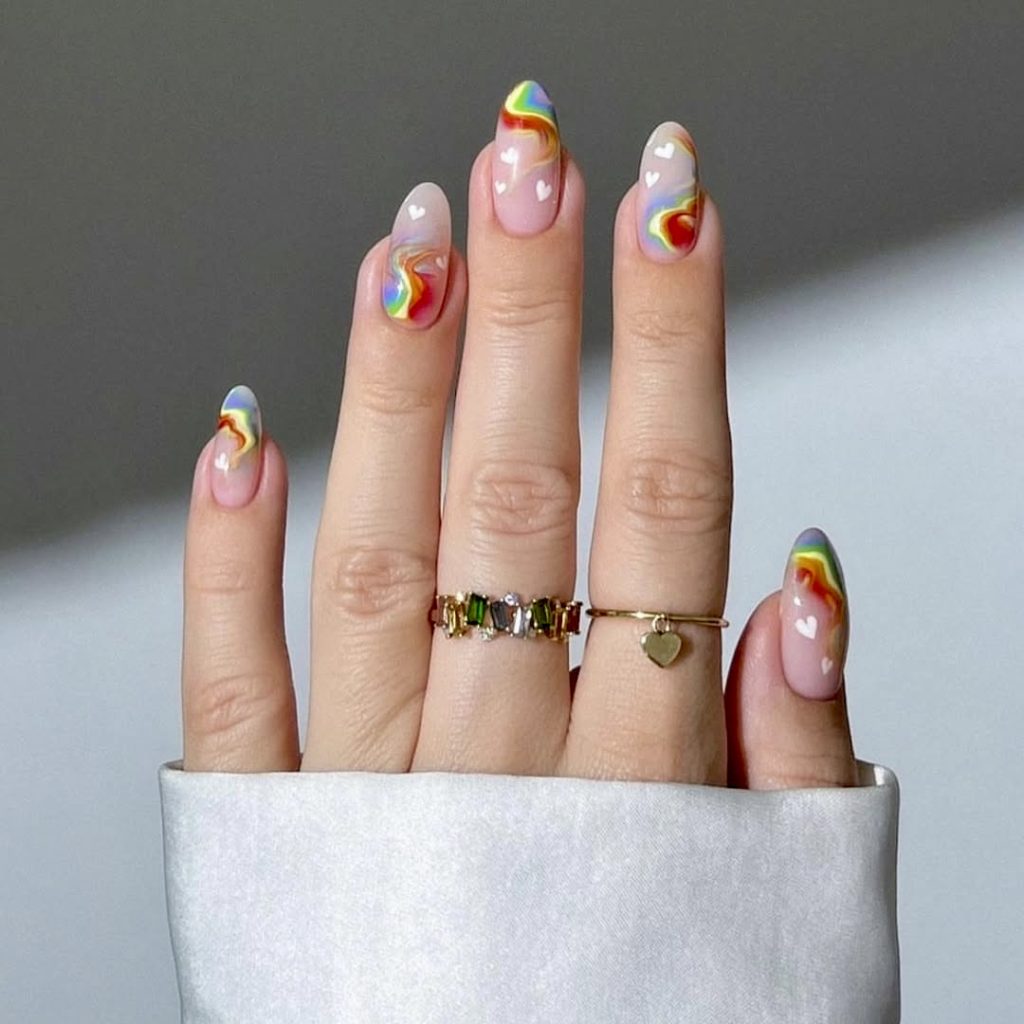 The dreamy almond acrylic design is greatly enjoying itself being the summer joy in the color. The base is soft and floating, while colorful tips are swirling like marbles of candy on each nail. Tiny white hearts make it romantic and the nails can be worn to Pride festivities or star-gazing date nights. This manicure’s beauty does not only lie in its appearance-instead, it is an expression of love for oneself and a reminder of the happy side of fashion.
