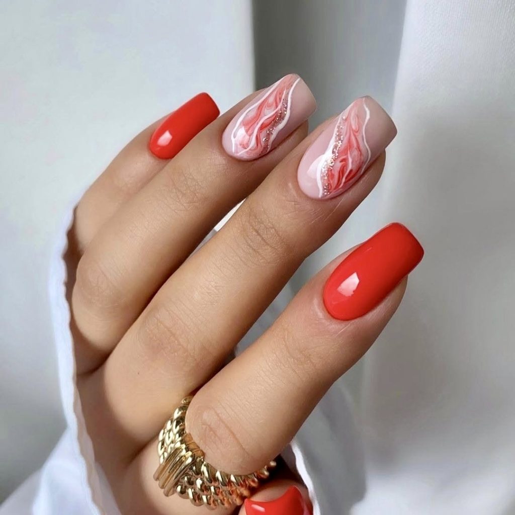These mini square nails were crafted by the very brilliant hairstylist. The bright coral red high-shine polish was combined with 2 accent marble nails; 1 of them was decorated with glittery pink, and the other with shimmery white. The strikingly different textures are making the design more dynamic and thus it is sufficient for a rooftop sunset party, but it is still elegant for everyday use. This is the perfect amalgamation of sleek and artistic—definitely the hottest summer trend.