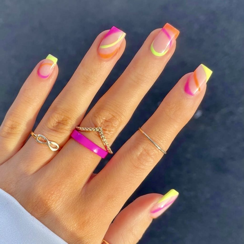 This manicure is a total neon pink, citrus, and yellow party; it reminds you of a tropical drink on your own fingertips. The square shape and rainbow swirl tips present the full range of summery colors in just one shine look. Although it is a bold design, it is surprisingly adaptable, especially with denim, white, or poolside looks. You want this lively design that speaks “fun in the sun”, then it has to be this one.
