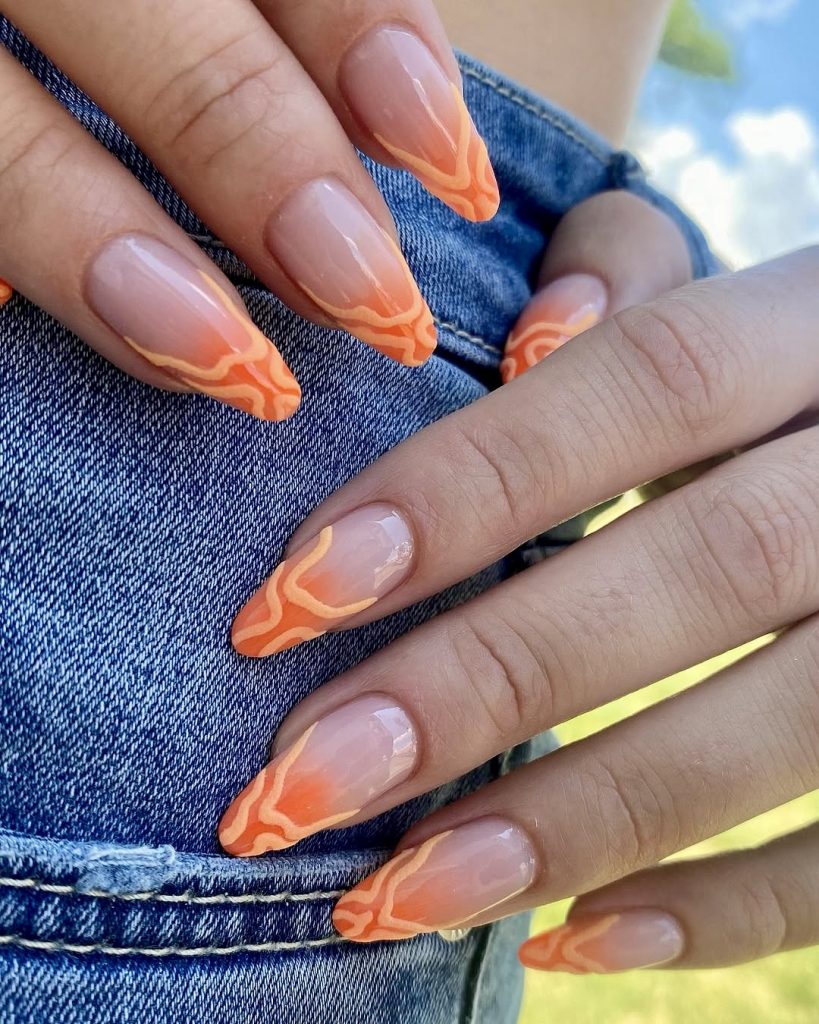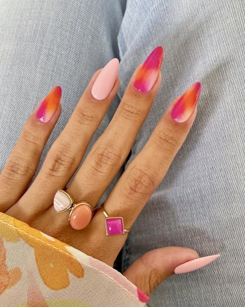 This is an interesting way to style the nails. If almod nails are the run of the mill choice but they can be transformed into the stylish long almond nails bringing orange heat with fire. The marbling of the bright colors of the tips creates an illusion of the flowing lava on the nude base nail, which is a cooling, mind-blowing combination. The design of the long almond nails is also great for the party on the beach or at night dancing under the stars, as they say hot pink meets flame-kissed glow, this design does that, and again it is just so hot against the blue denim and the sun-kissed golden skin.