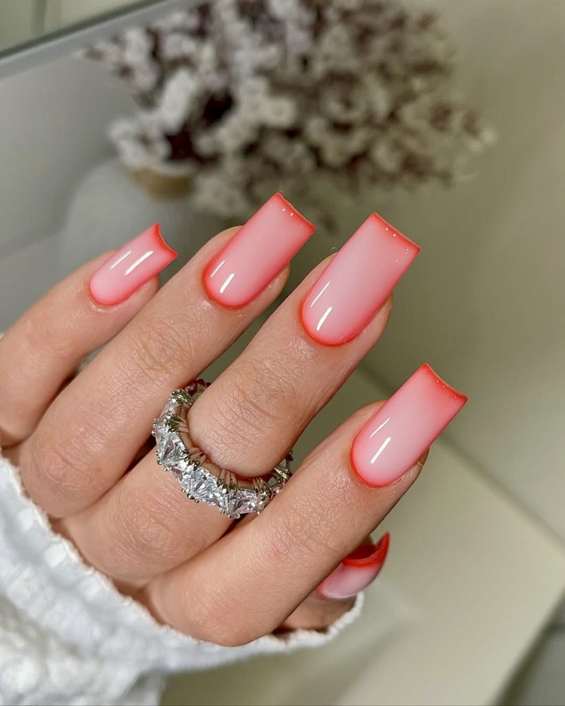This minimalist coffin design, which is a fashionable twist on the French tip, shows a hardly noticeable fade from soft pink to a fine red outline. The sharp square shape adds a modern and sophisticated touch whereas the gradient edge brings in a hint of summer’s bright color to the design. It is a manicure that simply transitions from a boardroom to a beach with ease – simple, classy, and looked after with no effort at all for 2025.