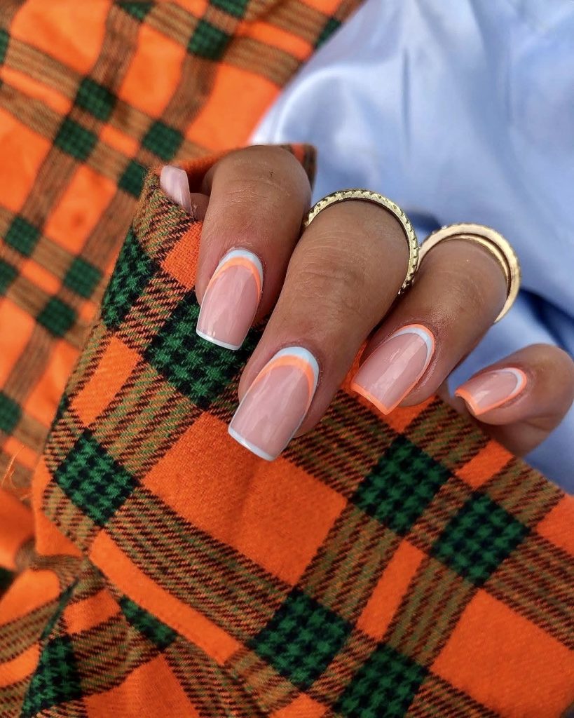 This square mini design is for an orange spritz swimming in the sun on a patio. The fine curves of orange and aqua on the naked base are lined with a barely visible white arc that is similar to the classic French tip but with a messy chock of color; the arc is not white. The design was kept very simple and wasn’t complicated; it is suitable to be worn on summer weekdays at work or during weekend brunch. This design can be worn with long, light summer dresses or with linen two-piece outfits.
