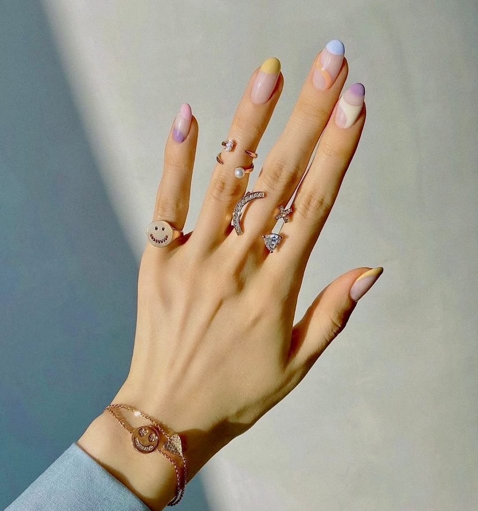 In this modern art-inspired nail design, soft natural tones are combined with a minimalist yet striking design. Summer is here and this look gives a relaxed touch to it with color-blocked tips in blue, lavender, pink, and lemon yellow on short almond nails. It still brings the gallery-girl vibe but is practical to wear daily; they could be perfect for pairing with a delicate chain and a loose-cut T-shirt.