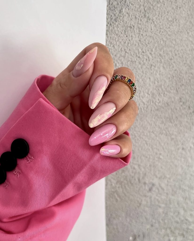 This glossy pink nails resemble vintage porcelain—soft, shimmery, and feminine. The light marbled texture on a few fingers adds a whimsical note, while a simple solid polish on some others is all it takes to achieve a dreamy blend of feminine elegance and trend-savvy polish. The almond-shaped design makes it look more refined. This is the reason it can be good for pairing with romantic blazers, silk dresses, and elegant bridal looks in 2025.