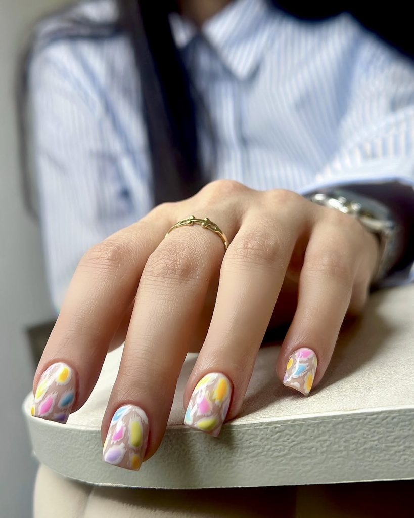 This simple short and short square manicure is like a mini celebration of summer fun. Don’t let the simple design fool you, it is packed with personality and individuality that it will easily make you feel excited. Besides the bright colors that are so joyful in the eyes, pink, lilac, and yellow are the pastel tones, which embody the summer spirit the most. The story that every nail tells is nothing but joy- the emotions that come to mind are smiley faces, tiny hearts, and interesting color-blocking. Instant summer is what I call this design- just put it on and you are ready to go. So, even if you are someone who likes a funky type of design that is also formal, this design is the best choice for you. Go ahead and wear it to a brunch date or music festival- that is what carefree looks like.