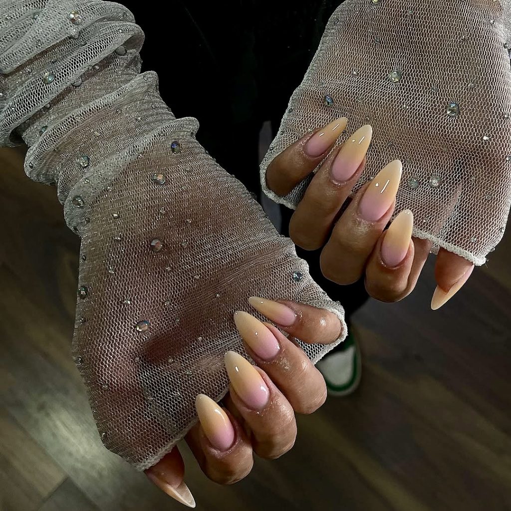 This almond acrylic manicure is the best illustration of the key to understatement in luxury. The impeccable merging of natural pink with the warm beige giving rise to the soft and elegant ombre is a perfect choice for all skin tones. Minimal crystals add to its magical feeling of a dreamy variation of the symmetrical French almond shape, which is suitable for weddings, summer dinners, or just lounging outside in the sun. This is a style that commands elegance effortlessly.