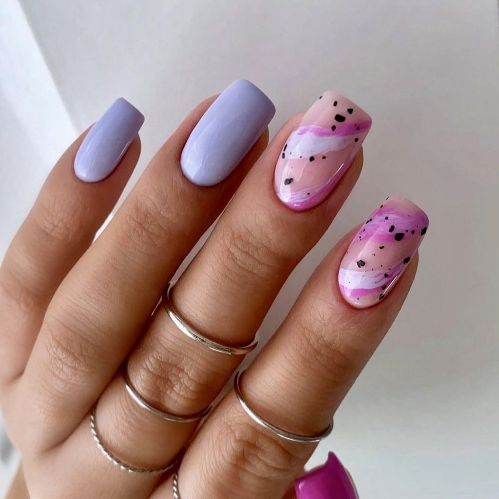This trendy blend of lavender and neon pink really creates a proper holiday feel for the nails. The square shape is a practical option, and the swirling pink art with black speckles gives it a twist of edginess. Regardless of if you put on a white sundress or a daring bikini, this design will definitely be an artistic addition to your summer. Hard to find, yet vibrant, this is a style for people who love to express themselves but prefer to stick with the practicable.