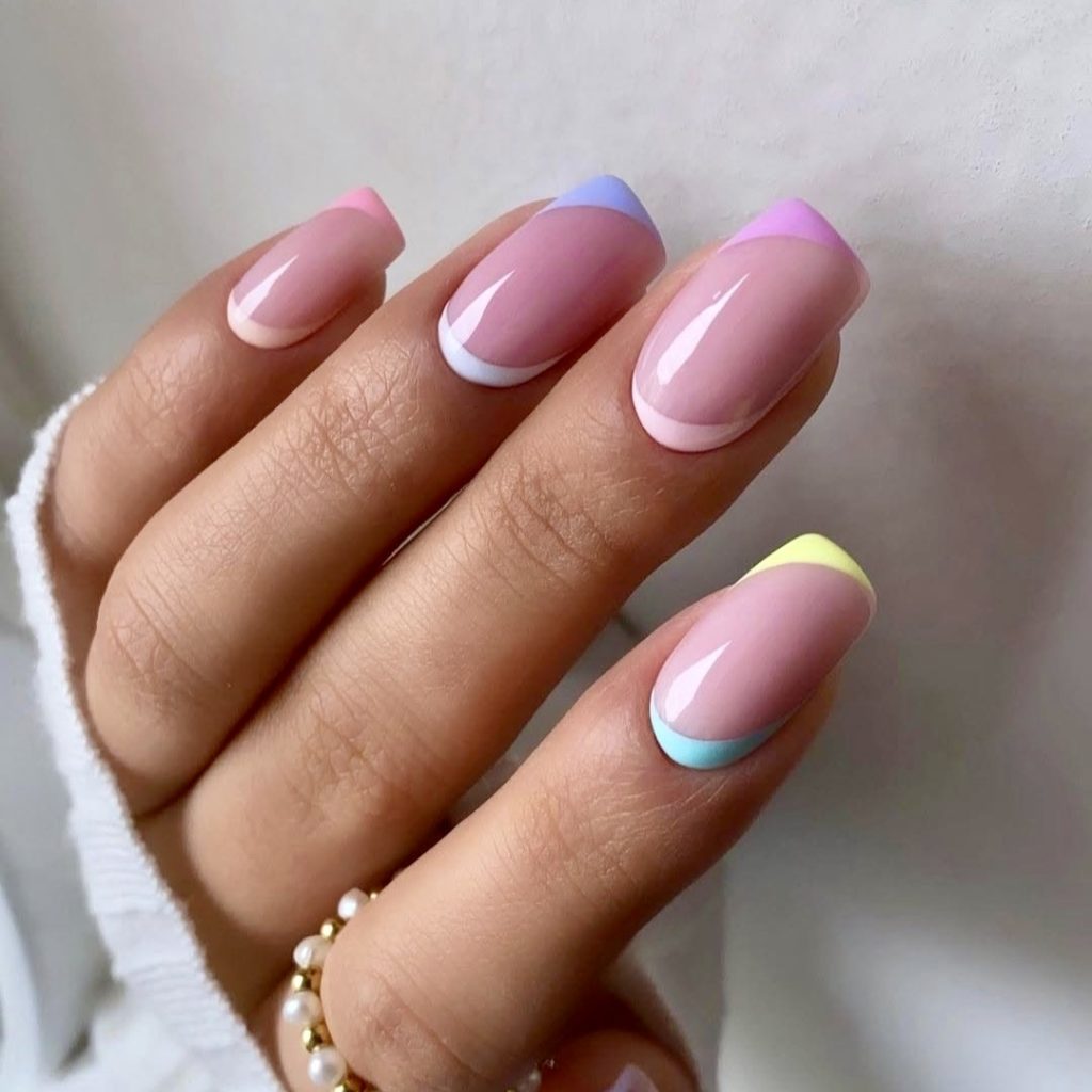 The short almond shape adds a modern update to this timeless look, making it perfect for both office days and beach weekends. If you’re someone who can’t choose just one favorite color, this simple yet joyful style is your summer go-to for the year 2025. The soft pastel tones of light blue, yellow, pink, and lilac, which are layered over a sheer nude base, are a clever twist on the classic French tip.