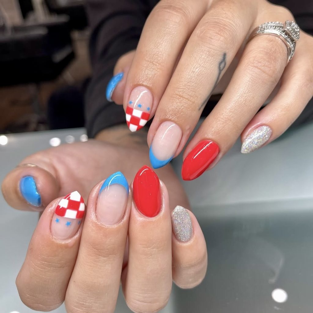The combination of brilliance and simplicity can be seen in this colorful manicure, which is a perfect choice for the 4th of July. The combination of red polish, shimmering glitter, and eye-catching blue French tips transforms the look appealingly to celebrate. The checkerboard accent nail, which has tiny blue stars on it, adds creativity and a DIY touch but yet remains salon nished. This mostly short nail with the shiny-manicures is a good and simple-to-apply technique for any arrival clam. The set is an ideal alternative for women seeking uncomplicated design suggestions that do not forgo elegance.