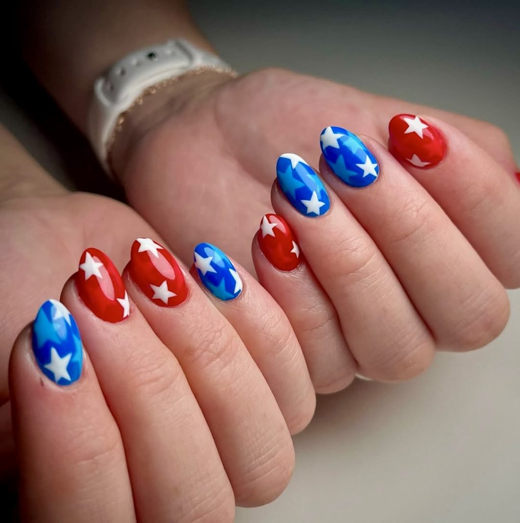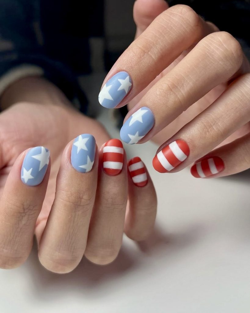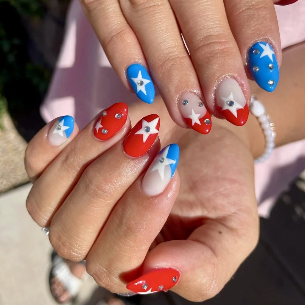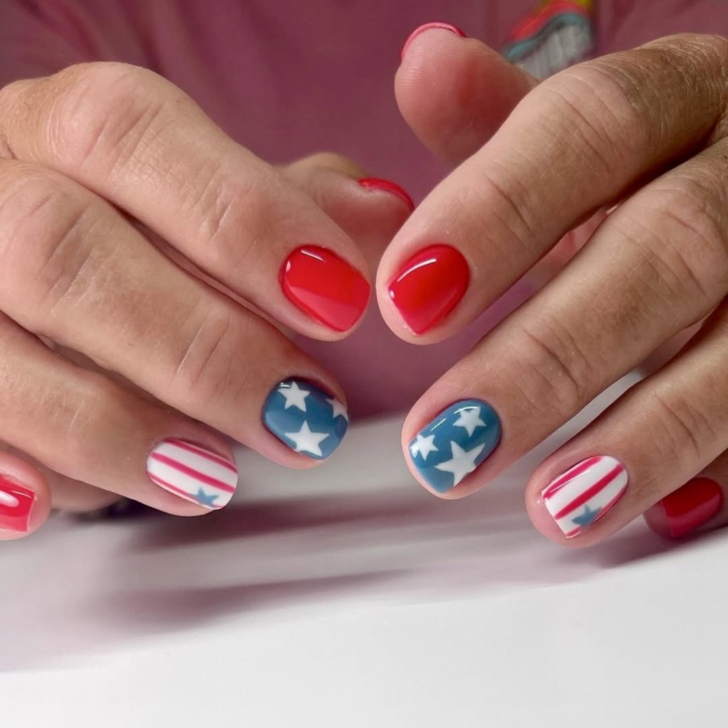 If you want to have a sparkling and lively look, this is the utmost style. The shimmery red and blue nail paints are accompanied by star designs, which are laid in multiple layers, thus this design is a perfect example of minimal effort to maximal impact. The shortened length of the nail adds a playful but practical element, and so they are fit for everyday wear during all the national holidays. This is a straightforward and stylish way to mark the time of the year, while at the same time, remain up-to-date and flexible for the year 2025.