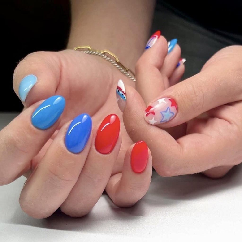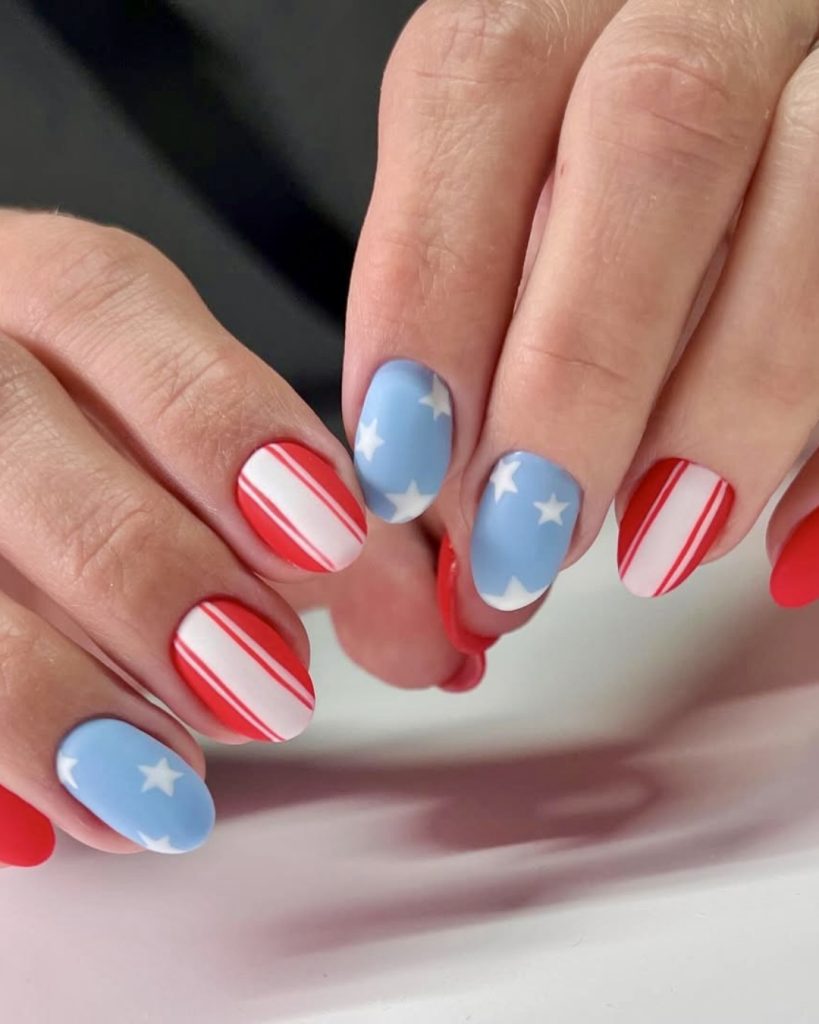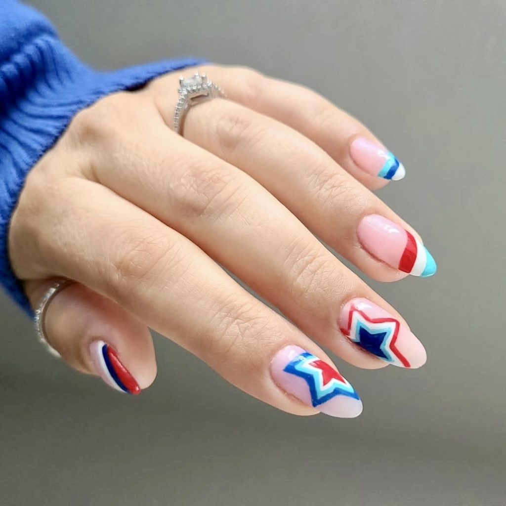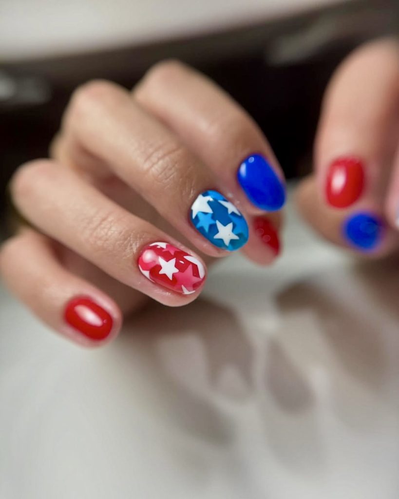 If you want to have a sparkling and lively look, this is the utmost style. The shimmery red and blue nail paints are accompanied by star designs, which are laid in multiple layers, thus this design is a perfect example of minimal effort to maximal impact. The shortened length of the nail adds a playful but practical element, and so they are fit for everyday wear during all the national holidays. This is a straightforward and stylish way to mark the time of the year, while at the same time, remain up-to-date and flexible for the year 2025.