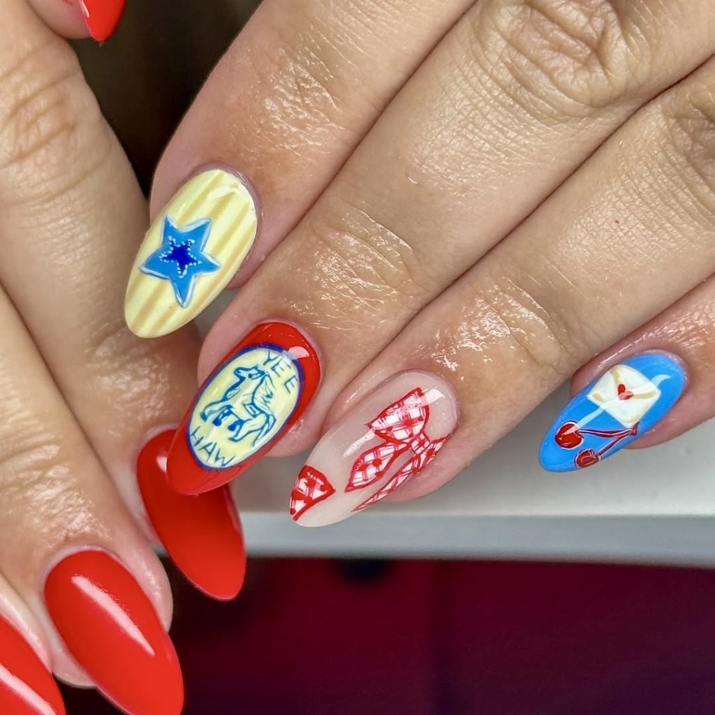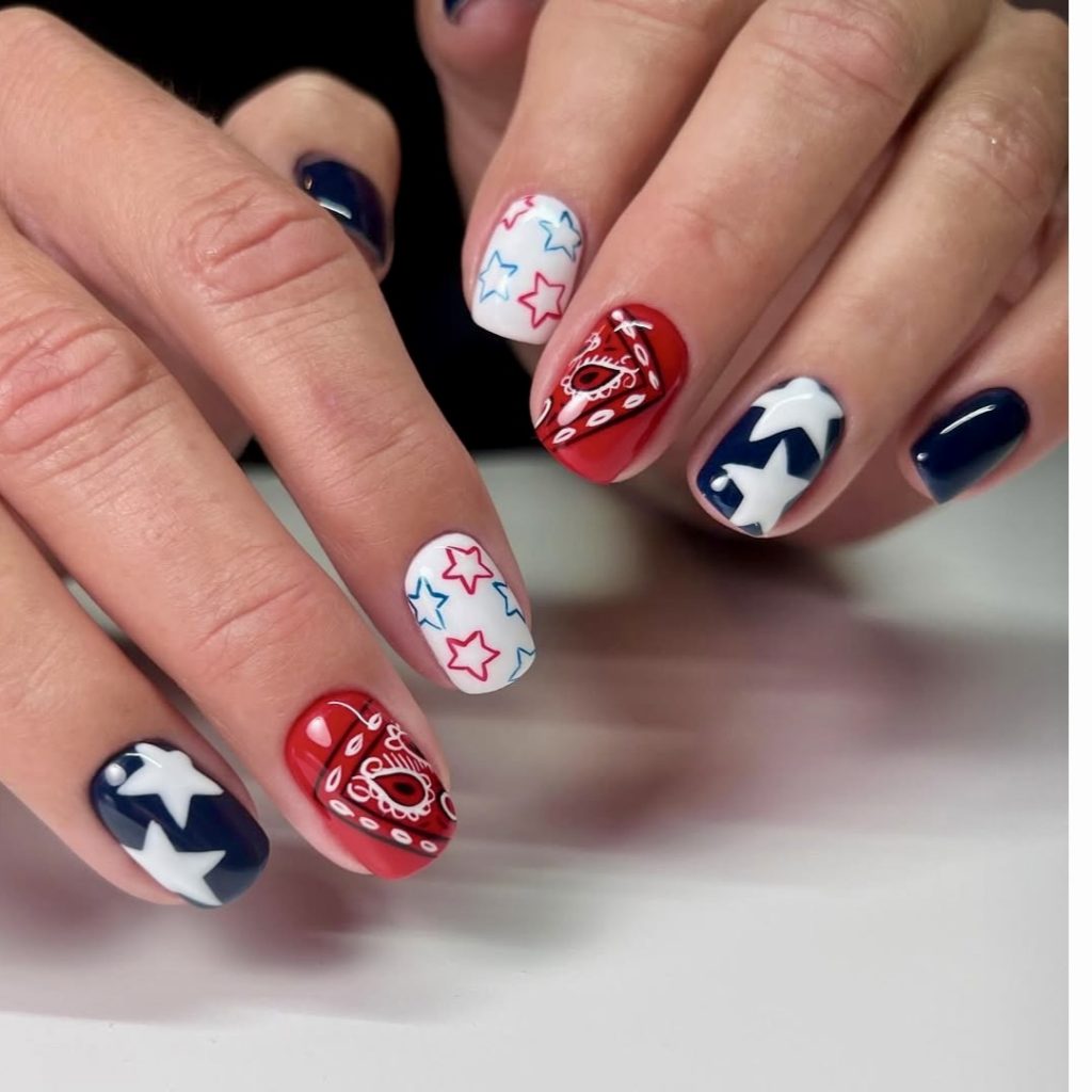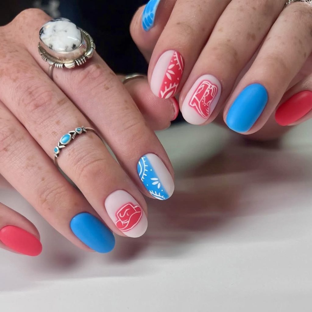 This eye-catching style has colorful colors of red and blue matte nails which are beautifully adorned with white bandana art while two accent nails remain unperturbed. It has a direct desert cowboy spirit and classy elegance simultaneously, thus particularly suitable for individuals wanting a bit of rural yet clean style. The small masterpiece of the cowboy hat design is so clever to put on a page of the design memorial theme and thus the nails become a special homage for Memorial Day or the 4th of July. The nail art would look amazing with a denim jacket and crisp white shorts that create a casual yet stylish outfit. Adhesively, the set of nails is not only easily enough for a fashionista or someone who wants a quirky look but also great for a friend looking for their first DIY project.