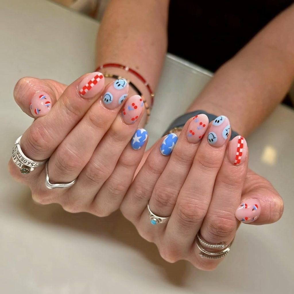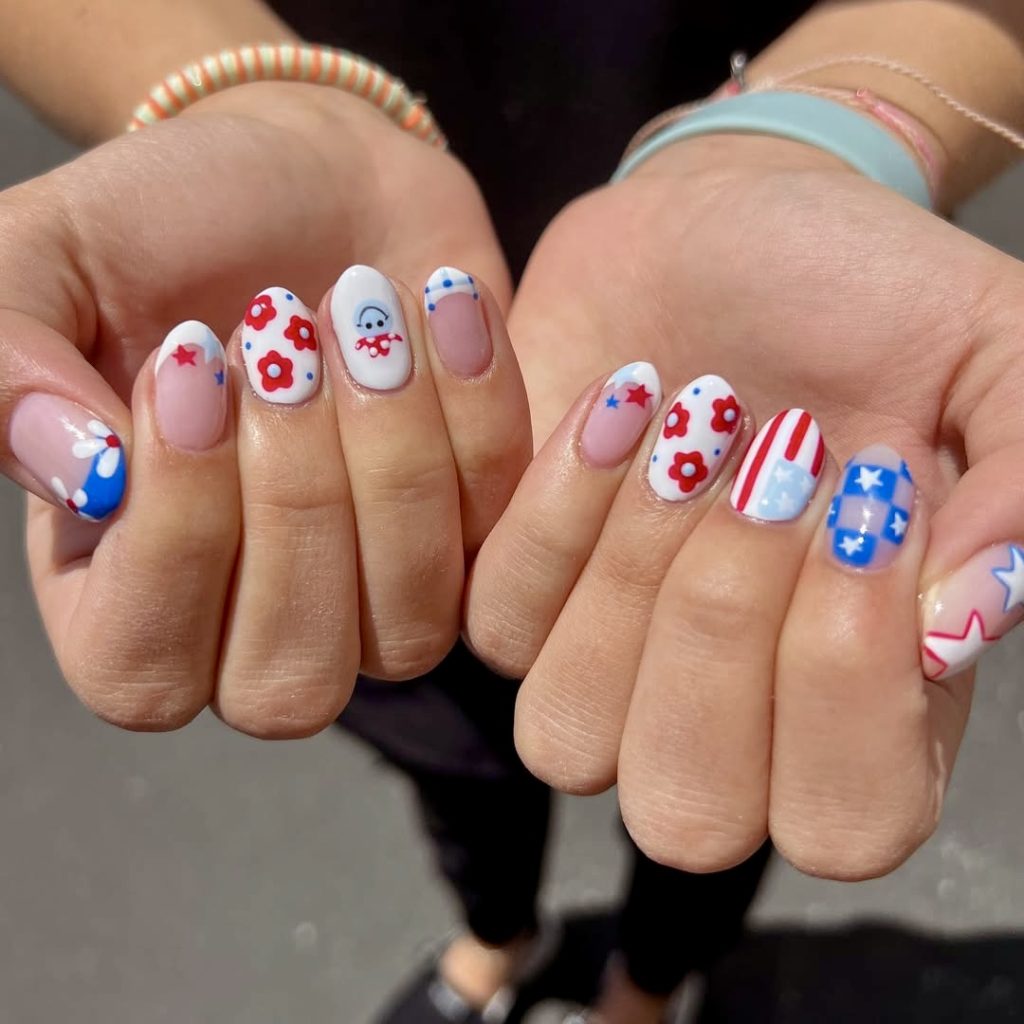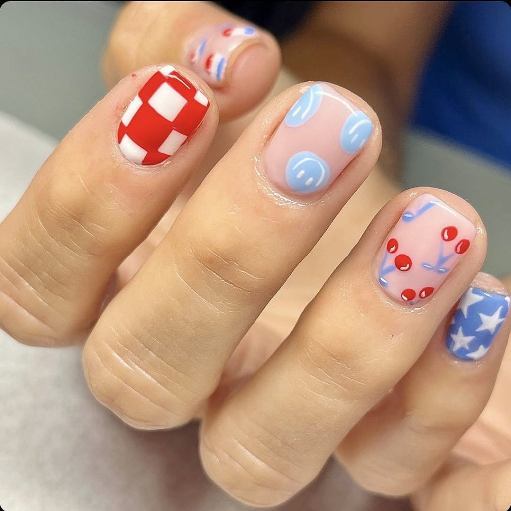 For those who love the essence of patriotic nails, but want a more low-key design, this Ray of creativity is for you. The delicate checks and floral prints of muted red, baby blue, and creamy white add up to the perfect combination of festive and low-key. The look has a base of grayish tones, which fits people who want a simpler version of the latest fourth of July trends. It would be just right for a stylish picnic or a relaxed barbeque in the year 2025.