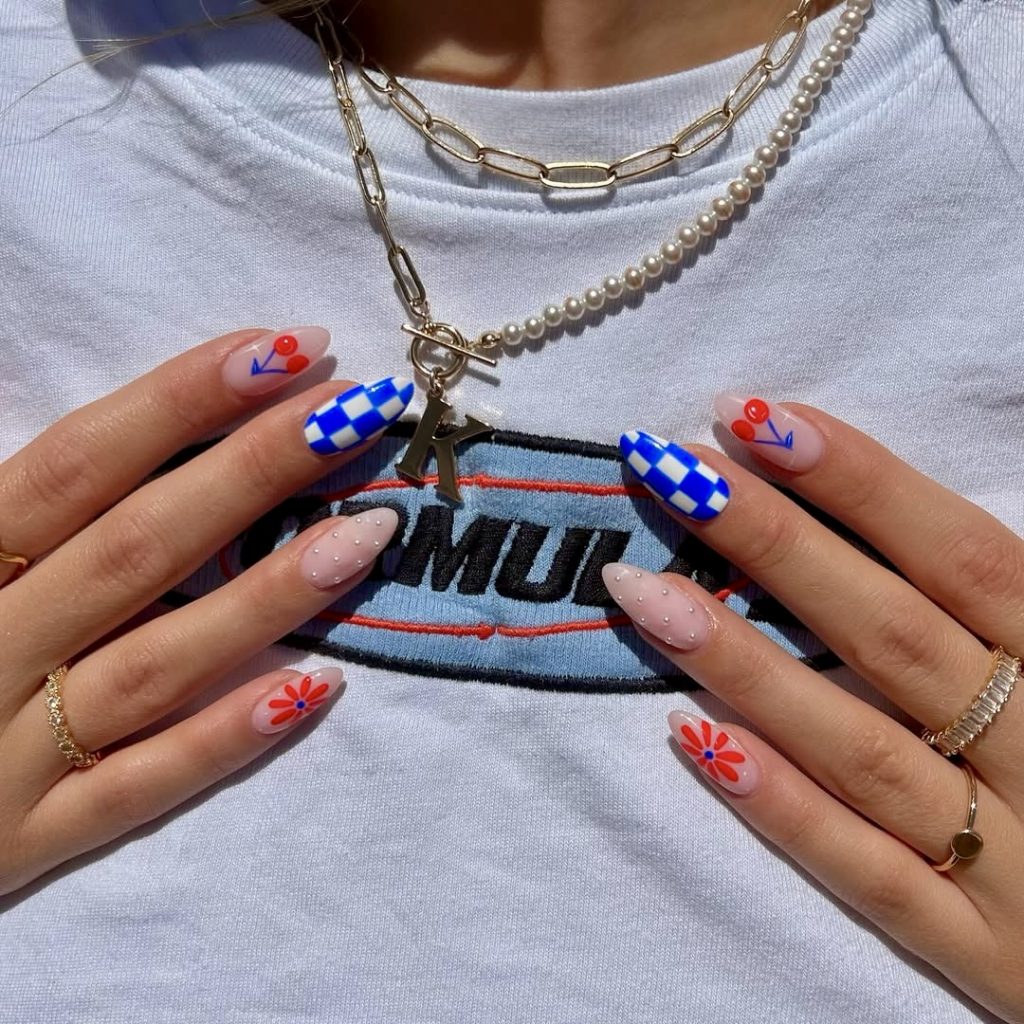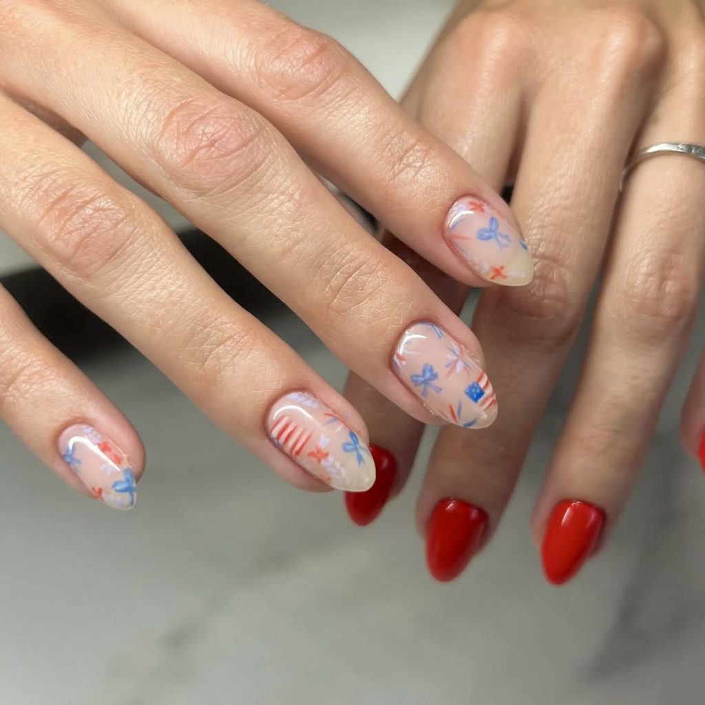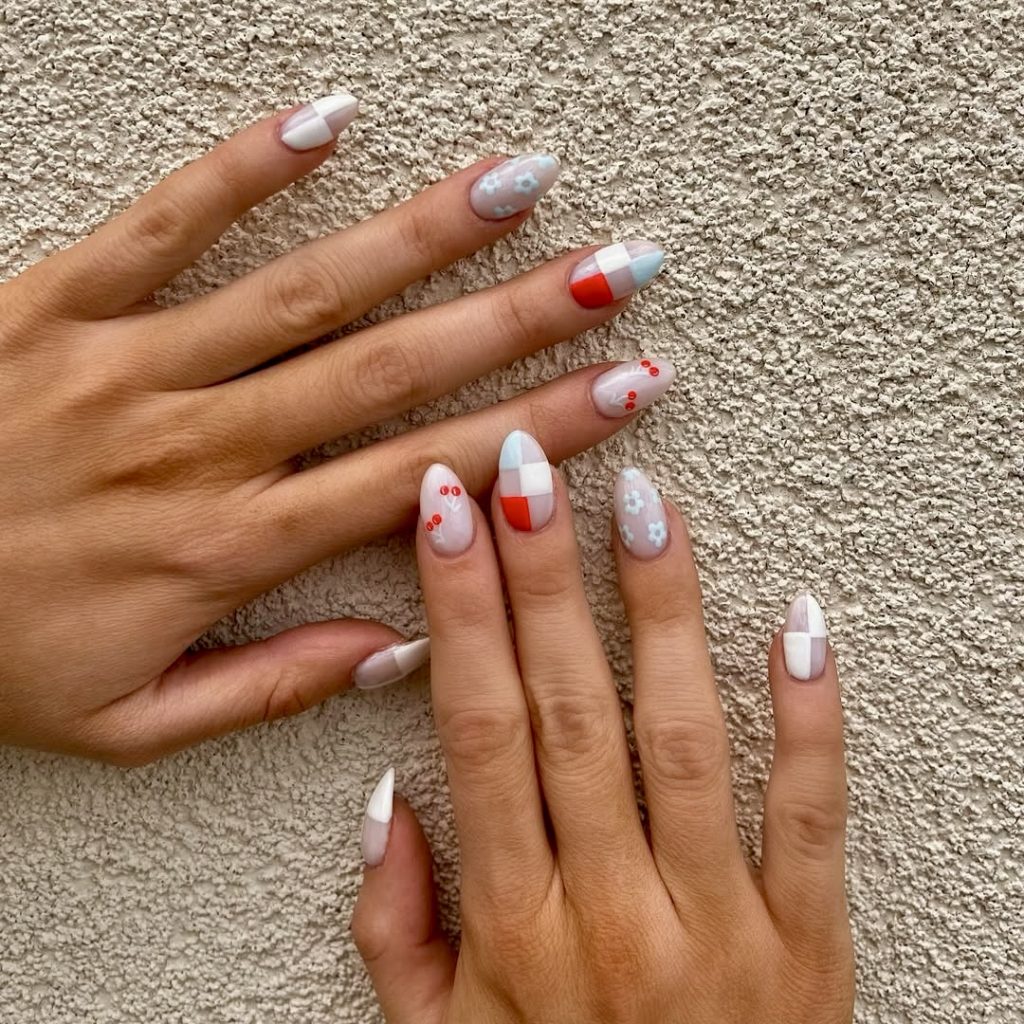 For those who love the essence of patriotic nails, but want a more low-key design, this Ray of creativity is for you. The delicate checks and floral prints of muted red, baby blue, and creamy white add up to the perfect combination of festive and low-key. The look has a base of grayish tones, which fits people who want a simpler version of the latest fourth of July trends. It would be just right for a stylish picnic or a relaxed barbeque in the year 2025.
