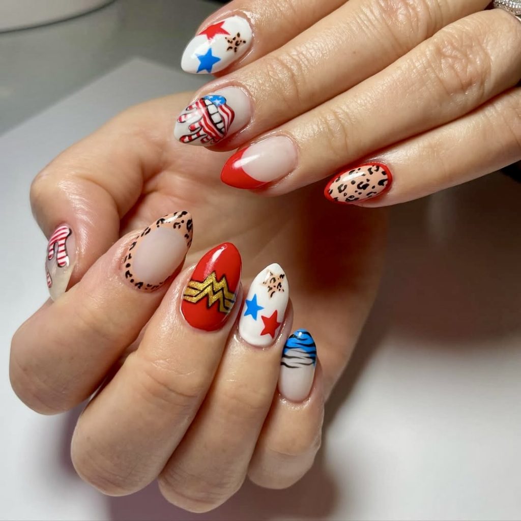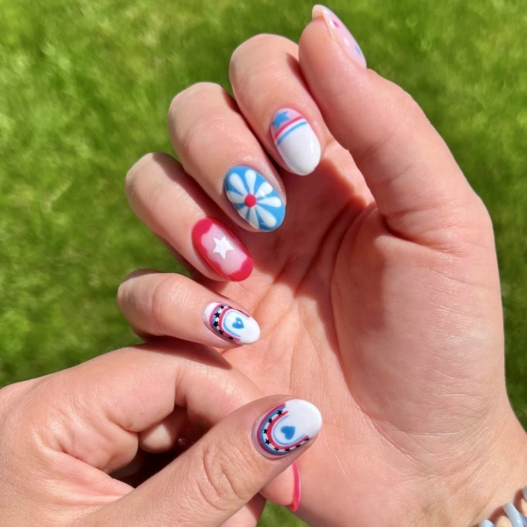 The design brings back serious retro vibes and infuses it with the creativity of a 70s artist with patriotic art at the same time. Each nail tells its own story featuring a variety of symbols like pop art hearts and funky stars to blue and red daisy motifs. This look is a combination of tributes to the past and national gasp—absolutely wonderful for women who consider themselves trendy, bold, and creative. Wearing this design on a memorial day weekend would be fabulous, as it does not only reflect but also brings out the traditional themes with a funny and lively touch.