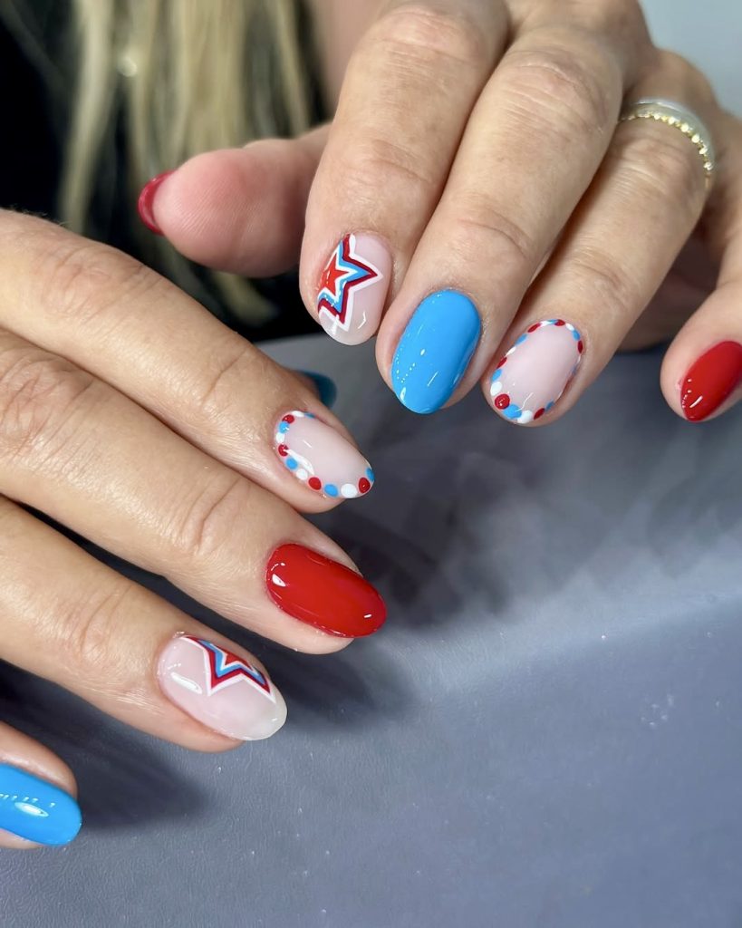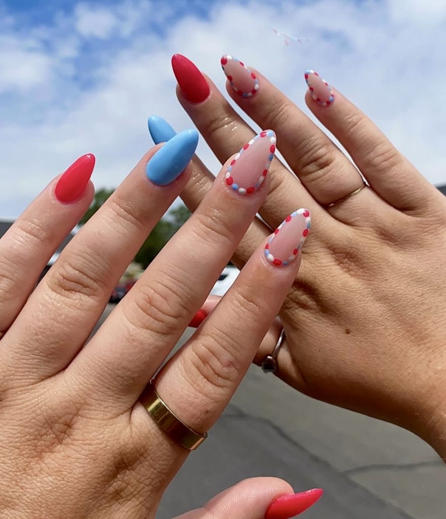This perfect nail trim is an excellent way to crate very simple but trendy looks, mainly with colorful bright red, sky blue, and pastel pink underlying the dotted decoration. It is an elegant, stylized version of the 4th of July, French tip nails that are not too showy. If you are looking for simple but trendy DIY, these neutral and at the same time festive nails will hold your preference easily in 2025.
