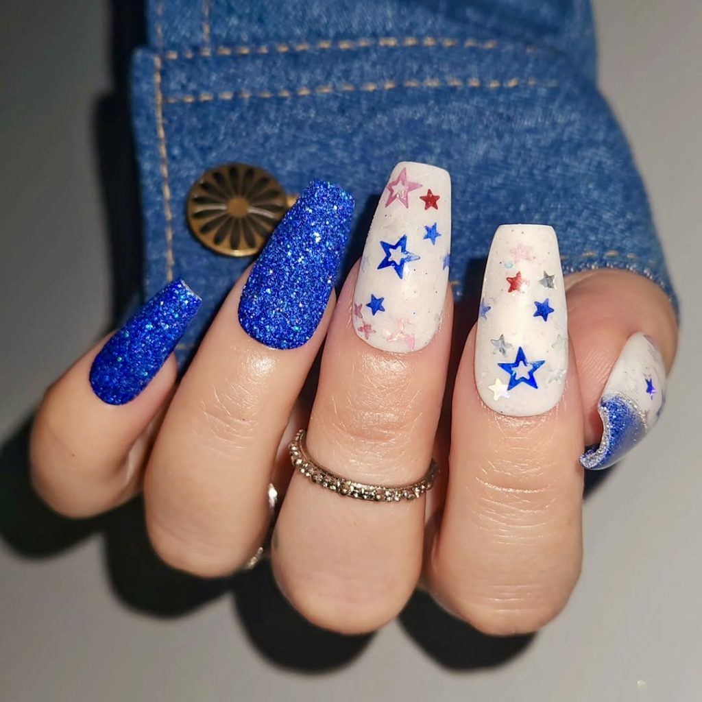This festive design truly gives you the feeling of a party at your fingertips. The chunky red, white, and blue glitter and the fine speckles along with the layered star details are the reasons behind the sparkles on these nails in the summer sun. Whether you are planning on wearing an elaborate 4th of July outfit or just want something simple that sparkles, this design does both fun and fashion with ease. It’s an ideal choice for women who want to wear the red, white, and blue energy but do not want to learn difficult nail art.