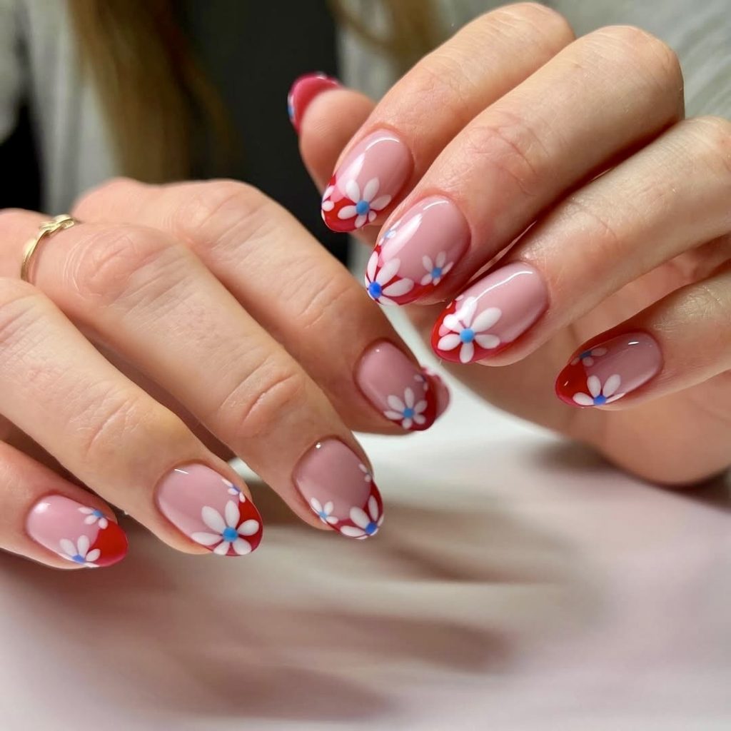 29. Floral French Tips with Patriotic Colors