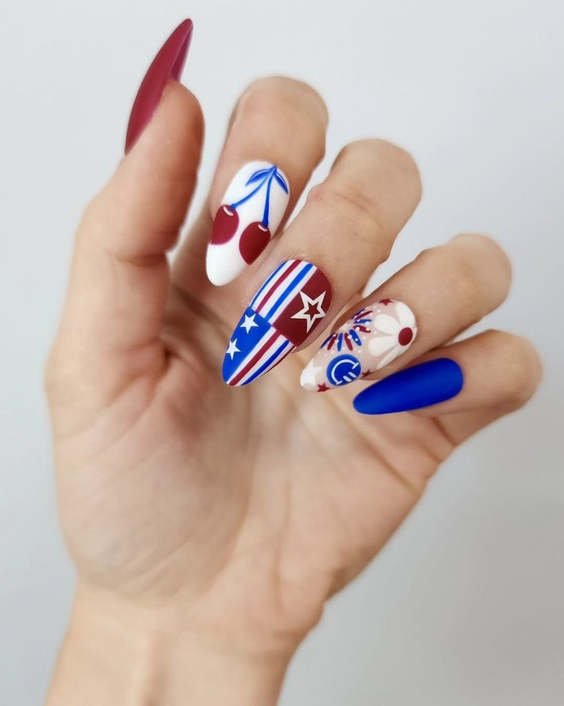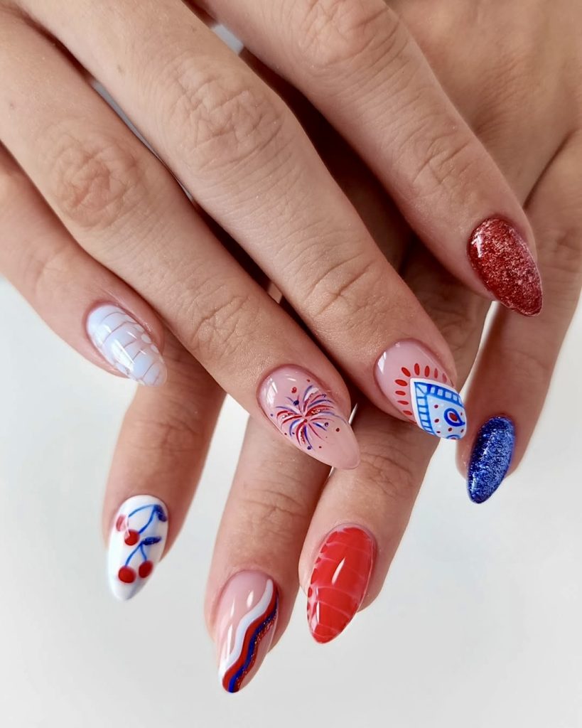 Long almond-shaped nails look playful with cherries, fireworks, and the patriotic stripes in this 4th of July French-inspired set. The design exhibited here is very astonishing and fanciful; however, it has not lost its ambiance to the occasion. If you are looking for a choice that is a little unconventional yet still commendable in the festive zone, this one is amazing. This is a definite reference to acrylic nail trends and seems to be very youthfully energetic and vibrant. A vintage graphic tee and high-waisted jeans are more than enough to make you look good for an Instagram-worthy picnic on the 4th of July.