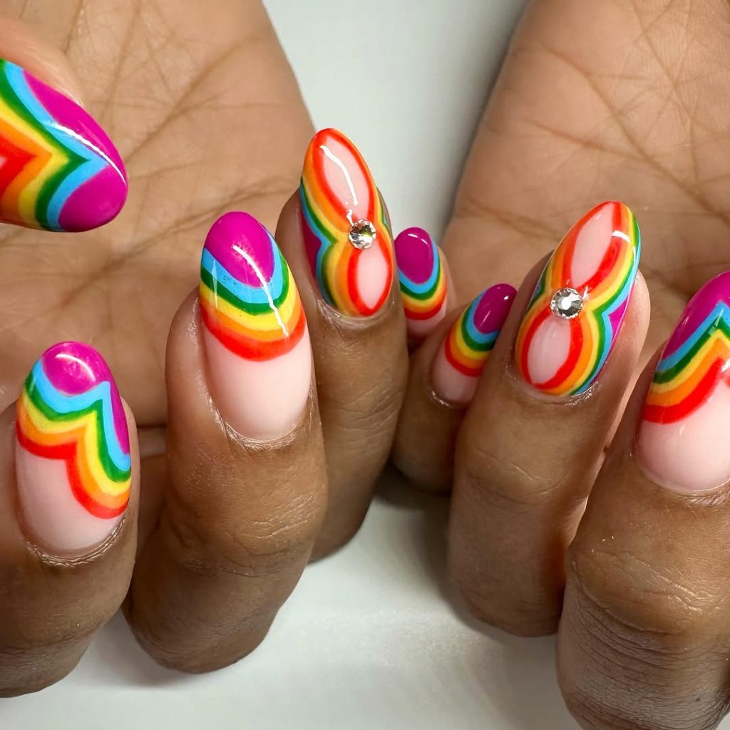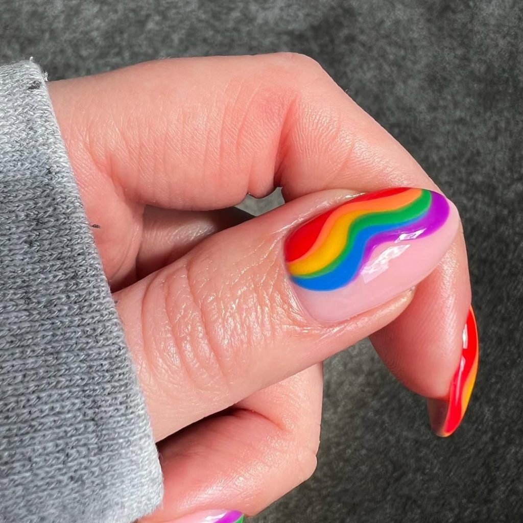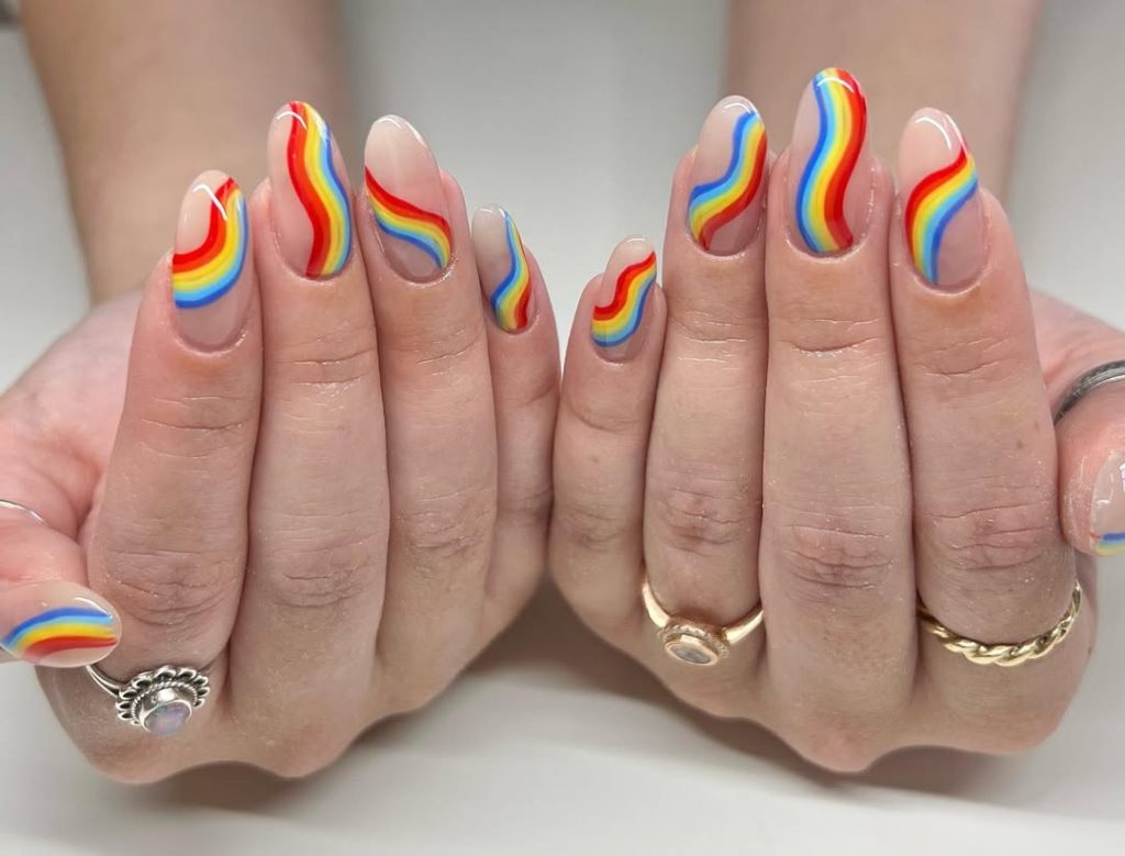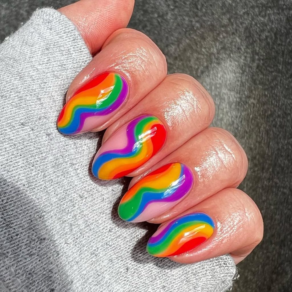 A simple almond form is the highlight of this manicure, which is a nude soft base, thus letting rainbow waves show off their beauty. The wavy finish of red, orange, yellow, green, blue, and purple creates a flow effect that is beautifully playful and elegantly simple at the same time. The design is ideal for those who wish to make a colorful but understated reference to Pride and is perfect with both casual and formal attire. The stylish touch can be obtained by adding it to the gold rings.