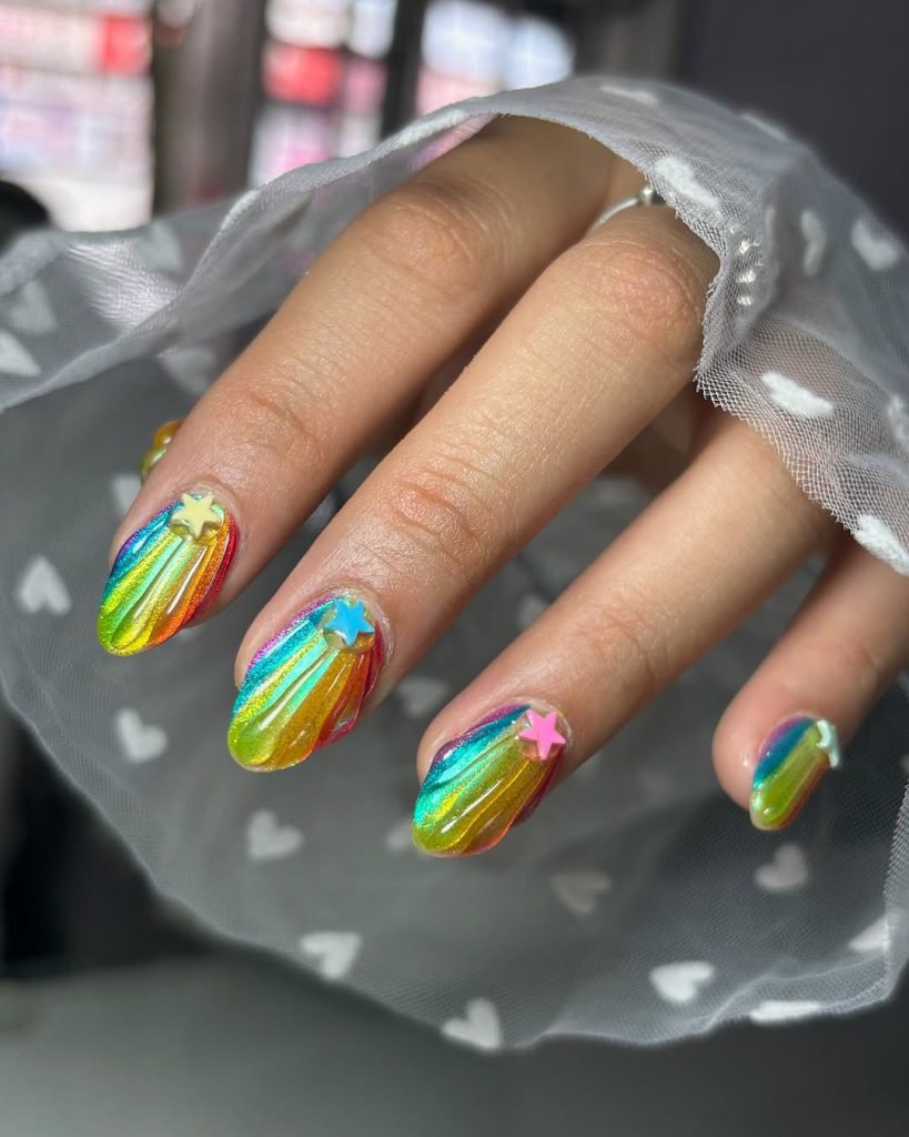 These nails are acrylics, and they go to a whole new level of the Pride theme with a special 3D effect. The brilliant rainbow stripes that look like they are falling down a comet street, together with small pastel stars that add a dreamy touch. The glowing chrome finish creates one more dimension of depth, and it is impossible to miss these nails, they are truly wonderful. The look would suit anyone who is keen on Disney or wants a touch of playfulness with a hint of objectivity. It would be great to wear them with soft pastels or metallics to enhance the futuristic vibe.