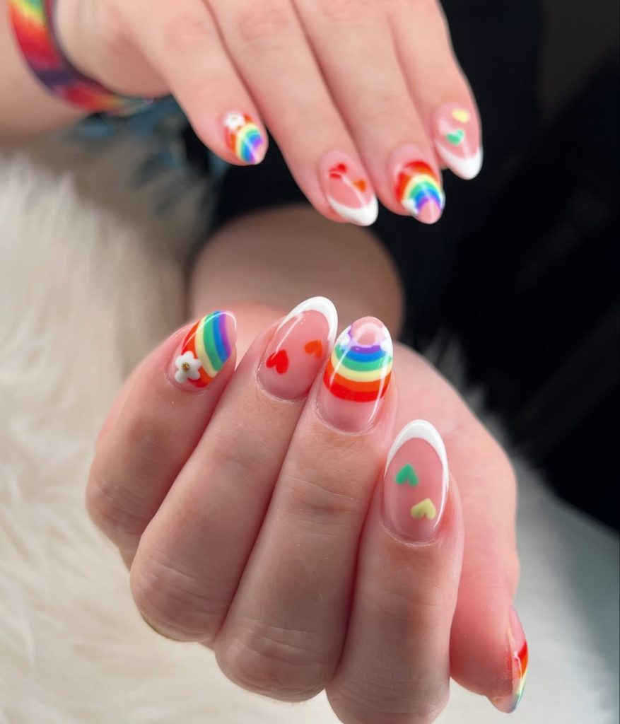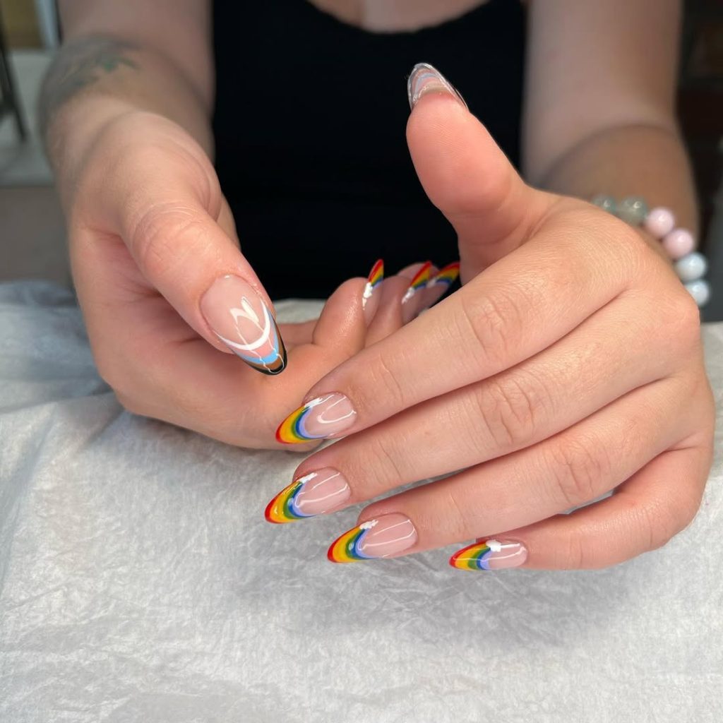This airy and fresh look has a beautiful combination of dreamy French tips and soft white curves with delicate rainbow arcs. The small cloud-like elements serve as a whimsical detail, thus making it a great choice for the people who are the fans of subtle yet meaningful Pride nails. The usual almond shape leads to a classic, elegant and suitable look for both, everyday life and special events. With this design, one can achieve a soft, romantic manner by simply combining it with small rings and neutral outfits.