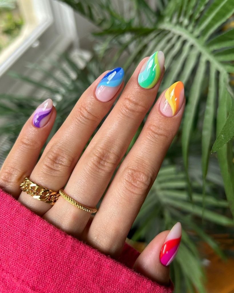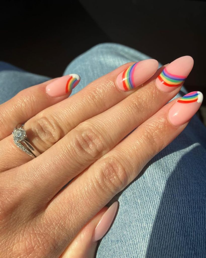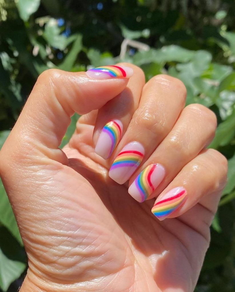 If you are the one of people who adore simple and short nails with a touch of creativity, this nail art is a recommended try. Every nail showcases a new pastel-colored swirl, thus forming a new, artistic, and unique effect. The colors of pink, blue, green, orange, and yellow are combined on a glossy nude base to get the look that is very fresh and young. For the seekers of easy and low-maintenance Pride nails, this is the perfect set, which is also suitable for casual outfits like denim shorts with a bright top and will give you a cheerful, summery vibe.